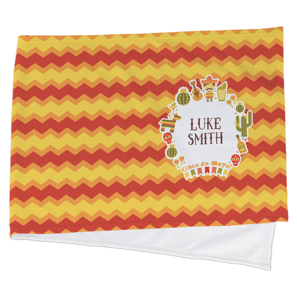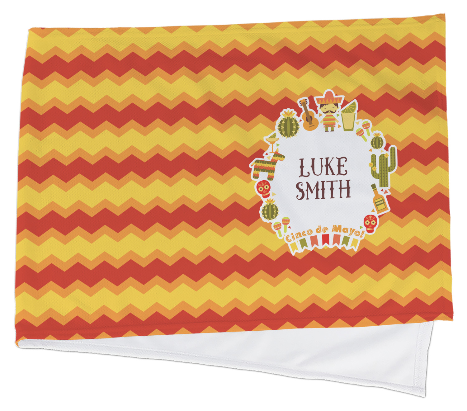 This design has many bright colors including red, orange, yellow, and green. The fun chevron gives a great pop to the fun frame that sits in the foreground. The frame has all kinds of fun illustrations like maracas, cacti, and even a mariachi man! The coordinating pattern has fun triangles all over with the phrase "Let's Fiesta!" all over as well. This really is the perfect design to get people hyped.
