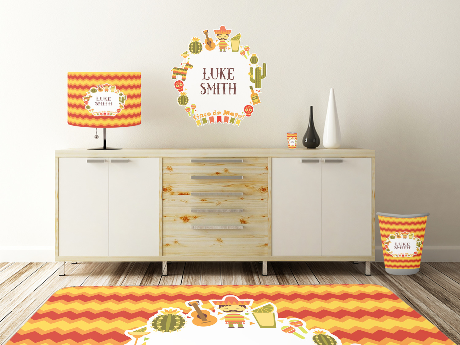 This design has many bright colors including red, orange, yellow, and green. The fun chevron gives a great pop to the fun frame that sits in the foreground. The frame has all kinds of fun illustrations like maracas, cacti, and even a mariachi man! The coordinating pattern has fun triangles all over with the phrase "Let's Fiesta!" all over as well. This really is the perfect design to get people hyped.
