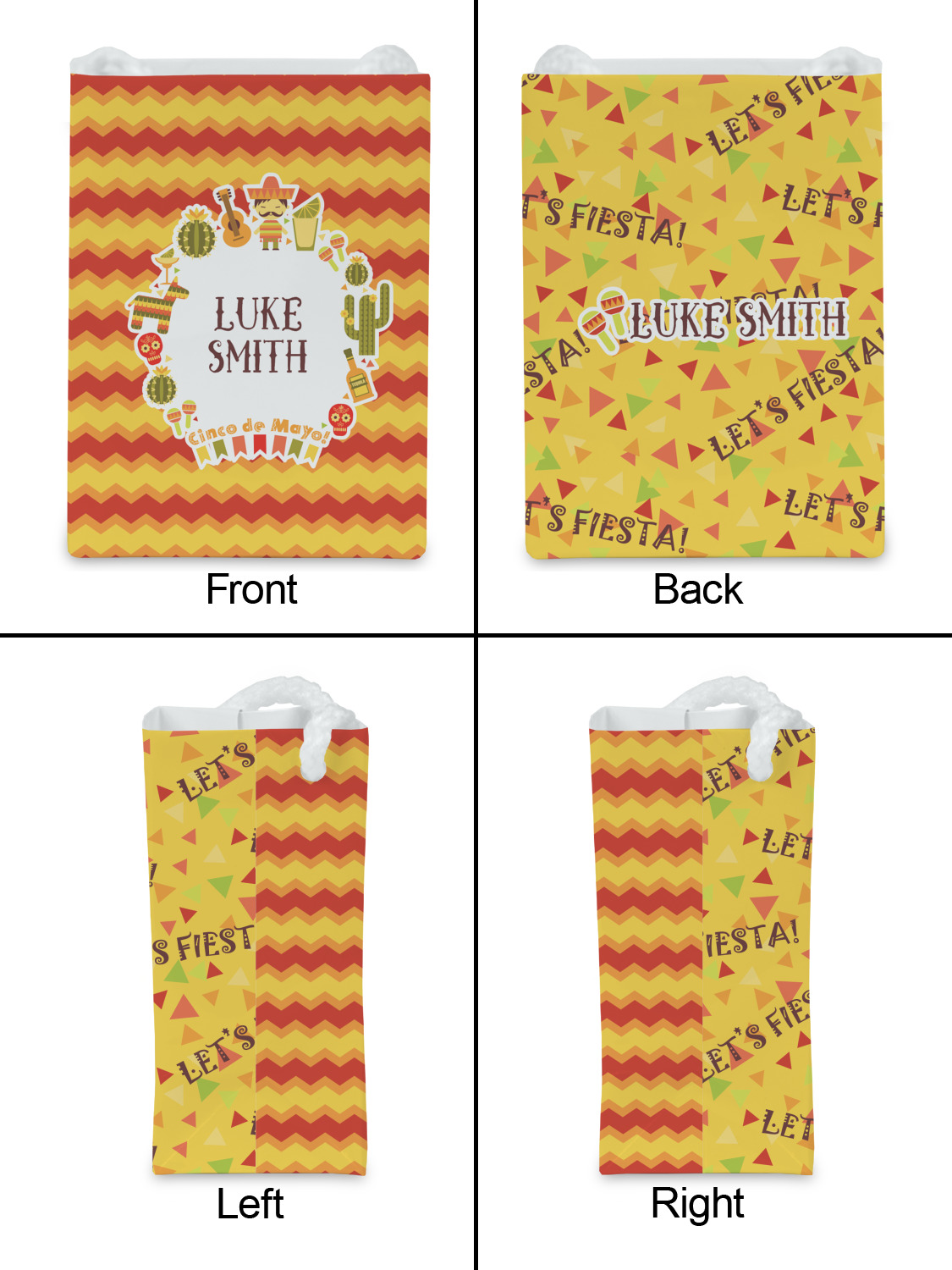 This design has many bright colors including red, orange, yellow, and green. The fun chevron gives a great pop to the fun frame that sits in the foreground. The frame has all kinds of fun illustrations like maracas, cacti, and even a mariachi man! The coordinating pattern has fun triangles all over with the phrase "Let's Fiesta!" all over as well. This really is the perfect design to get people hyped.