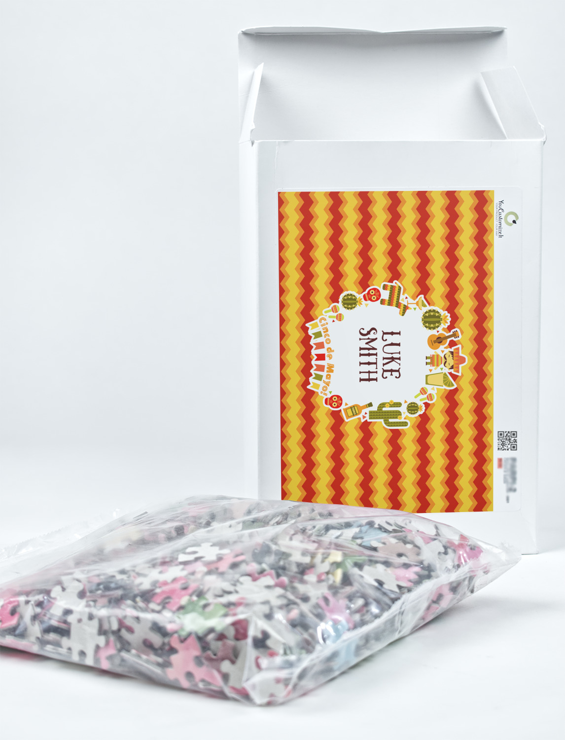 You can also upload your logo or art that you or your kids drew. To create more challenging jigsaw puzzles, you can create a pattern from with your logo or artwork. You can also add other elements such as text or personalization.