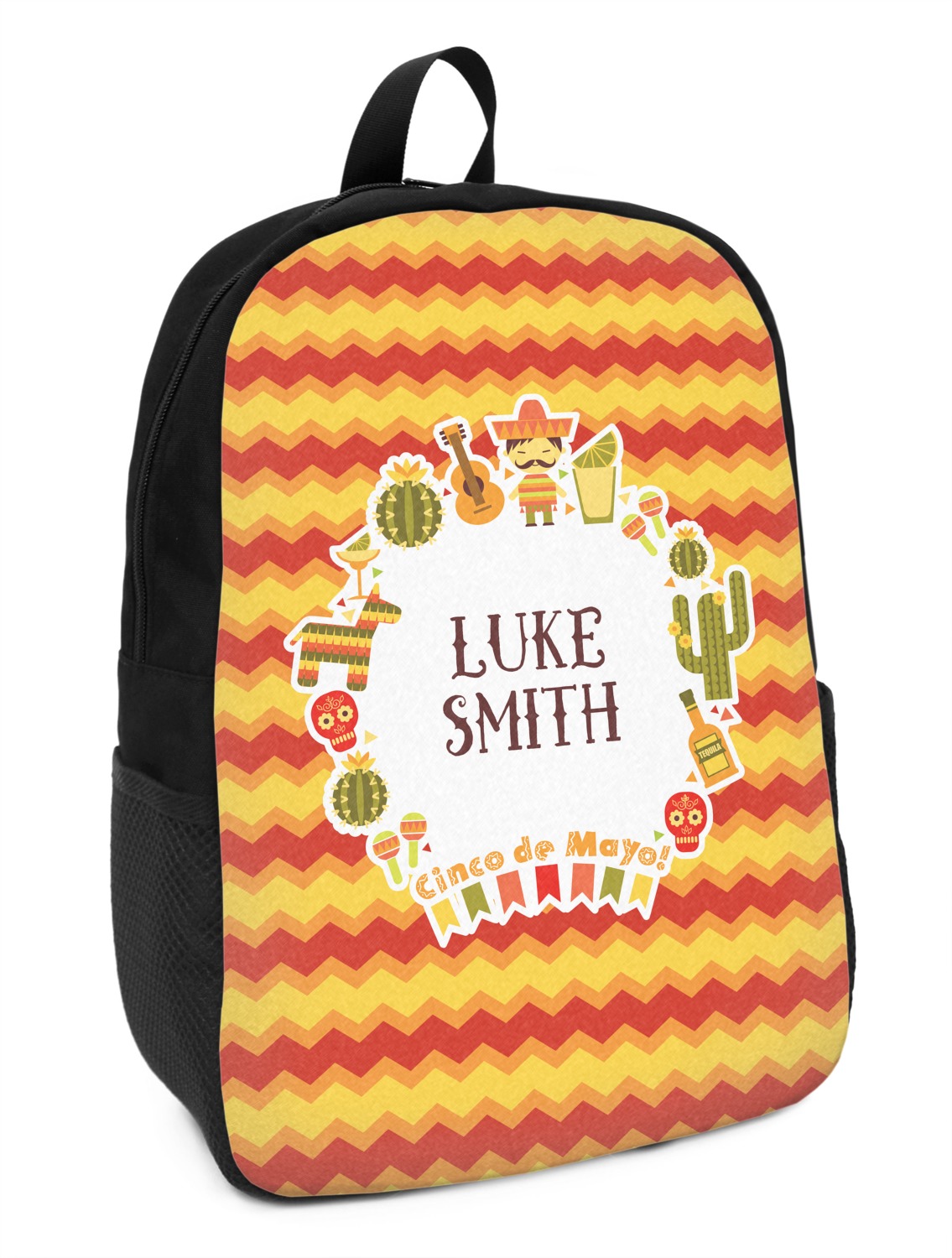 These small backpacks are made of a durable black canvas material with your personalization right on the front. The two shoulder straps are padded and easily adjustable. The bag itself measures at about 11" W x 15" H x 5" D. It's the perfect size for elementary aged kids or adults who want a smaller backpack. On the top of the bag you will find a handle to hang or carry your backpack by as well as a large zipper closure to keep all of your belongings safe inside. On each side of your backpack is a mesh pocket for a small item or water bottle. Inside your backpack you will find a spacious area with a small zipper pocket and a padded laptop slot that will fit up to a 13" laptop (13" being very snug). This is the perfect bag for any student that needs a couple books and their laptop with them at all times. It also works great as a carry on for traveling!