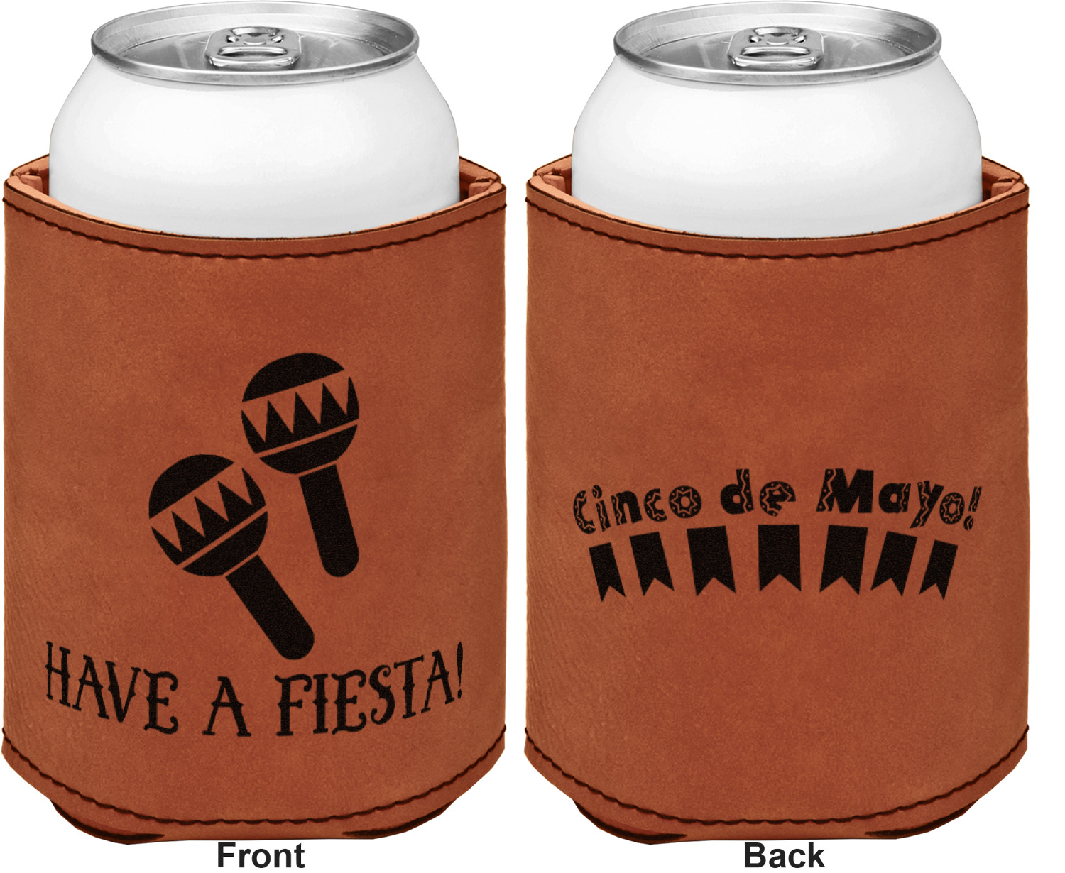 This can sleeve is made from a cognac-brown leatherette and stitched with a sturdy, black thread. A slim padding lines the inside of your can sleeve to allow for a better fit once your drink is inserted. The sleeve itself measures at 4 by 4.5 inches, allowing this custom can sleeve to accommodate most canned drinks. Your personalized design can be engraved on the front and back, or solely the front. When laser-engraved, your design appears as a black coloration which contrasts the leatherette nicely.