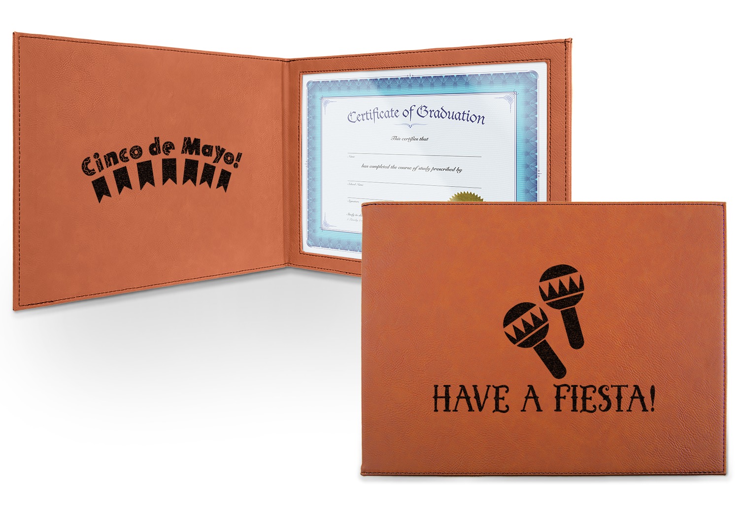 This cognac-colored, leatherette certificate jacket is the ideal way to display or store your hard-earned certificate. When closed, the custom certificate holder measures at 12 by 9 inches. The interior of the certificate cover includes a clear, vinyl window to encase your diploma. The window measures at around 10.5 by 7.5 inches and can accommodate a diploma that measures at up to 8.5 by 11 inches. You can either choose to have your customization laser engraved on the front and interior, or solely the front.