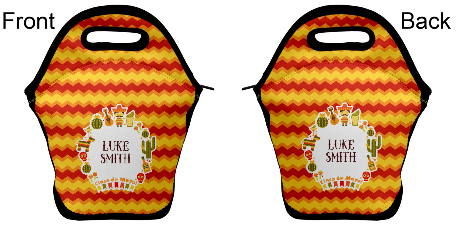 Our personalized lunch bags are made from a strong neoprene, and secure with a zipper closure that lines the top of the bag.The edges of the neoprene are sewn together with a heavy duty stitch, adding to the durability of the bag. The is accompanied by a reinforced handle at its top, for the easy transport of your lunch. We display your personalization across both the front and back of this neoprene lunch bag, while the remaining sides are a sleek black in color. Each bag measures at 13.5 inches tall, and 11.5 inches wide.