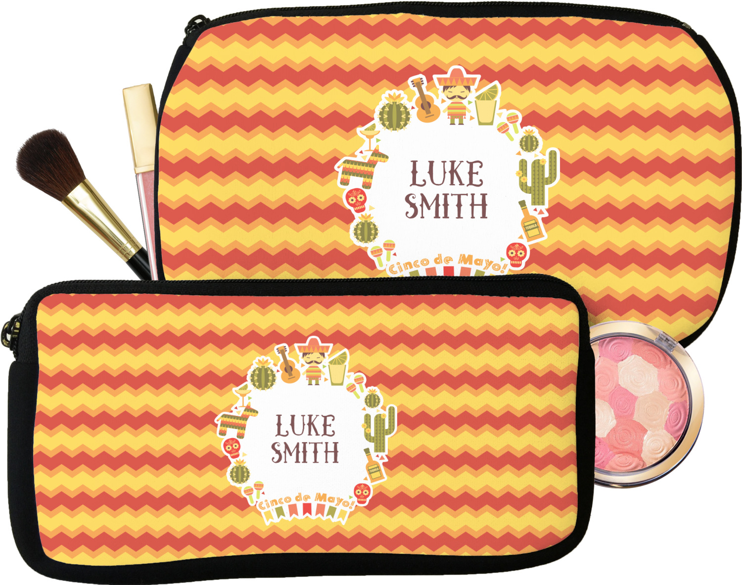 Our personalized makeup bags are available in many different designs, patterns and colors - so you are sure to find one that will love. They are made of neoprene (same material as wet-suits) and thus are water resistant, so spillages in your makeup bag will not end up all over you purse. They are customized on one side and are black on the other side and the zipper is black as well.