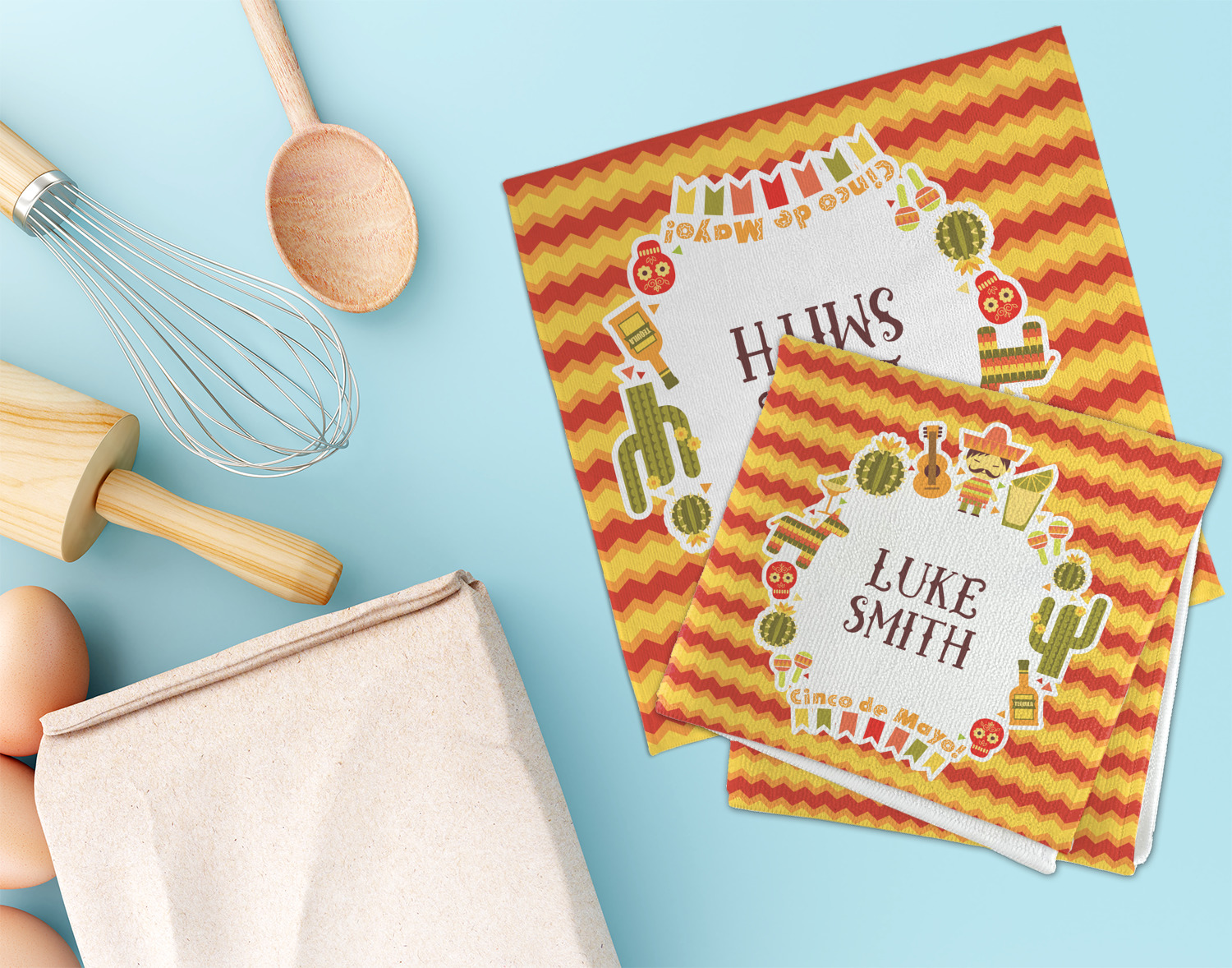 This design has many bright colors including red, orange, yellow, and green. The fun chevron gives a great pop to the fun frame that sits in the foreground. The frame has all kinds of fun illustrations like maracas, cacti, and even a mariachi man! The coordinating pattern has fun triangles all over with the phrase "Let's Fiesta!" all over as well. This really is the perfect design to get people hyped.