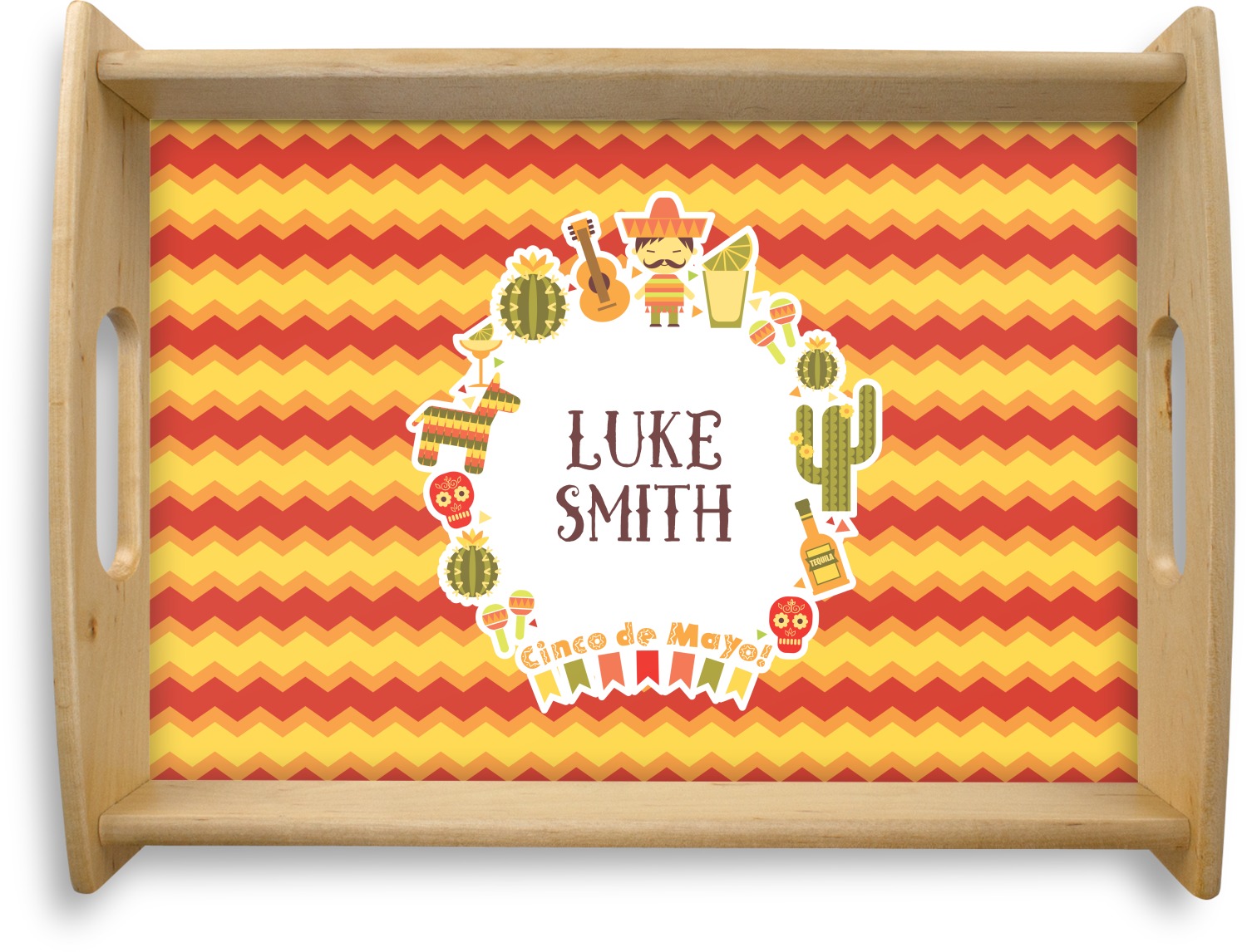 This serving tray with handles features square edges and two rounded sides, creating a very modern look. Each side is fabricated from a beautifully cut, natural wood. The bottom of the interior of the tray displays your customized design in bright, vibrant color. The tray is sold in both a black color and a natural wood look. Each variation of the wood serving tray has two sizes: Small, which is 14" x 10" x 2.25", and Large, which is 19.5" x 13.5" x 2.75".