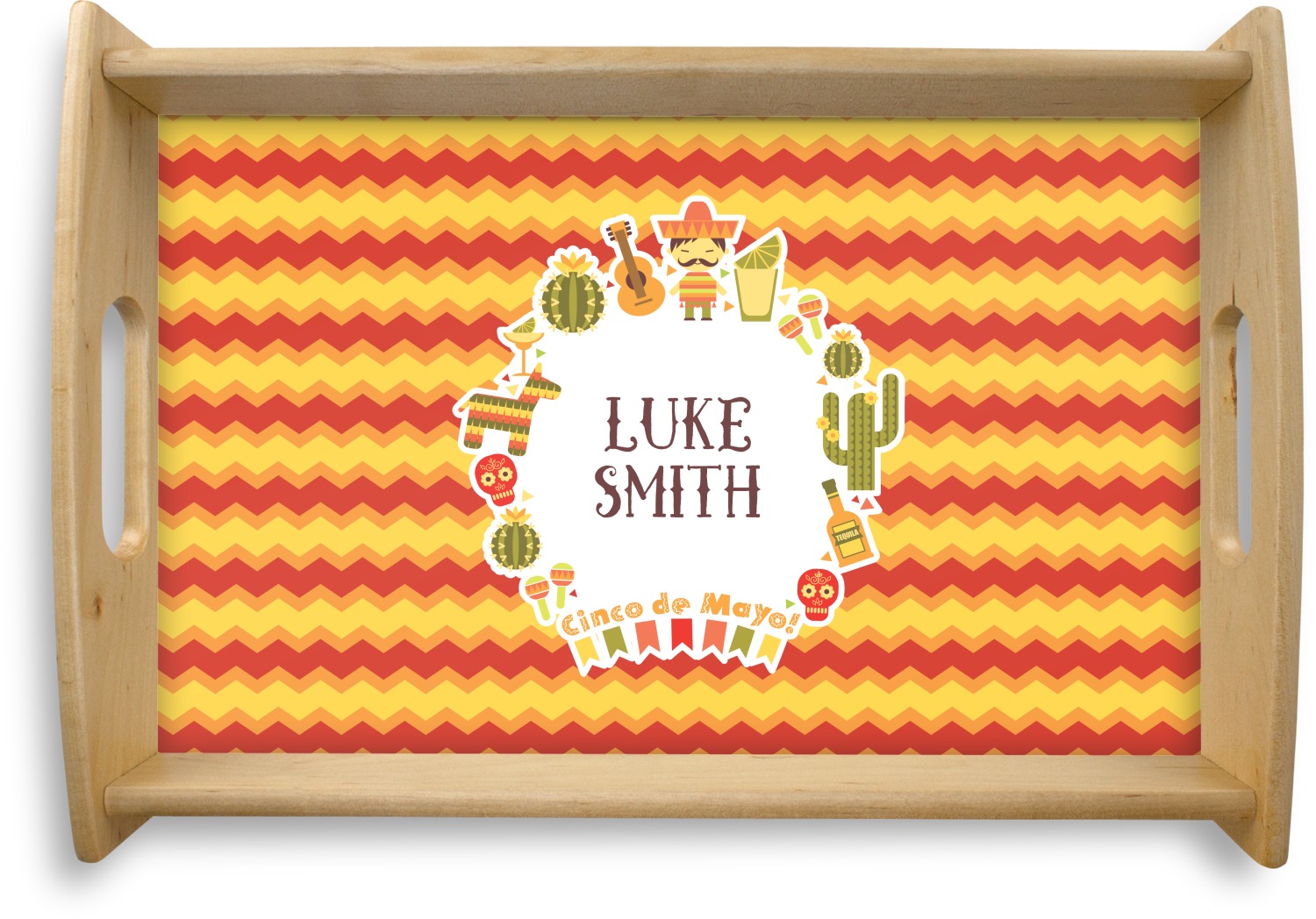 This serving tray with handles features square edges and two rounded sides, creating a very modern look. Each side is fabricated from a beautifully cut, natural wood. The bottom of the interior of the tray displays your customized design in bright, vibrant color. The tray is sold in both a black color and a natural wood look. Each variation of the wood serving tray has two sizes: Small, which is 14" x 10" x 2.25", and Large, which is 19.5" x 13.5" x 2.75".
