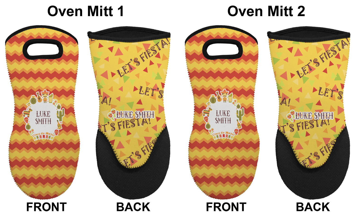These heat resistant gloves are made entirely of a durable neoprene; the front features a softer texture, while the palm's side has a textured surface, meant to handle heat up to 500 degrees Fahrenheit. Thick, heavy duty stitching connects the two sides. A small, oval cutout appears on the front, and can be used to hang and store the mitt. Your personalization appears on the front, and the upper part of the back of the mitt. The style of these oven mitts are suitable for both the right and left hand, depending on your needs. If you need one for each hand, be sure to order two!