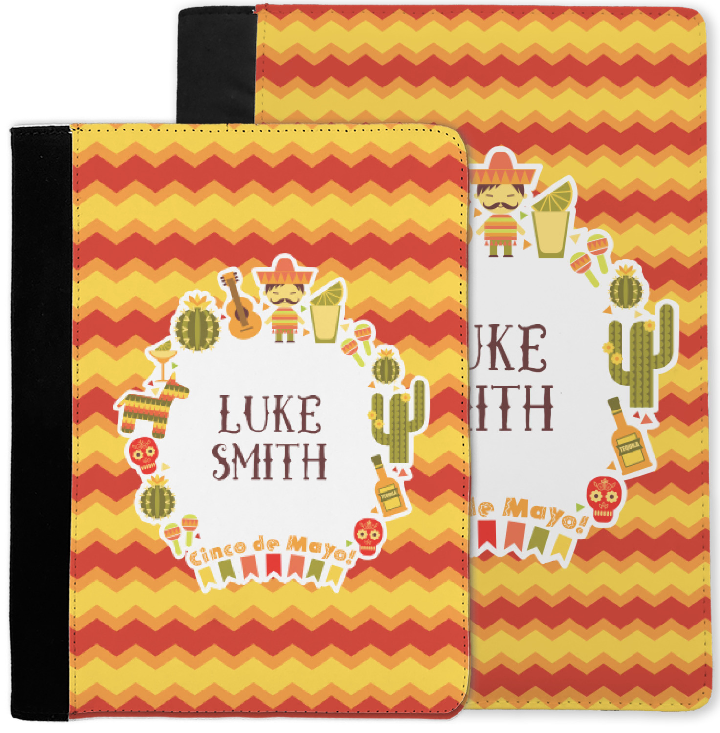 This design has many bright colors including red, orange, yellow, and green. The fun chevron gives a great pop to the fun frame that sits in the foreground. The frame has all kinds of fun illustrations like maracas, cacti, and even a mariachi man! The coordinating pattern has fun triangles all over with the phrase "Let's Fiesta!" all over as well. This really is the perfect design to get people hyped.