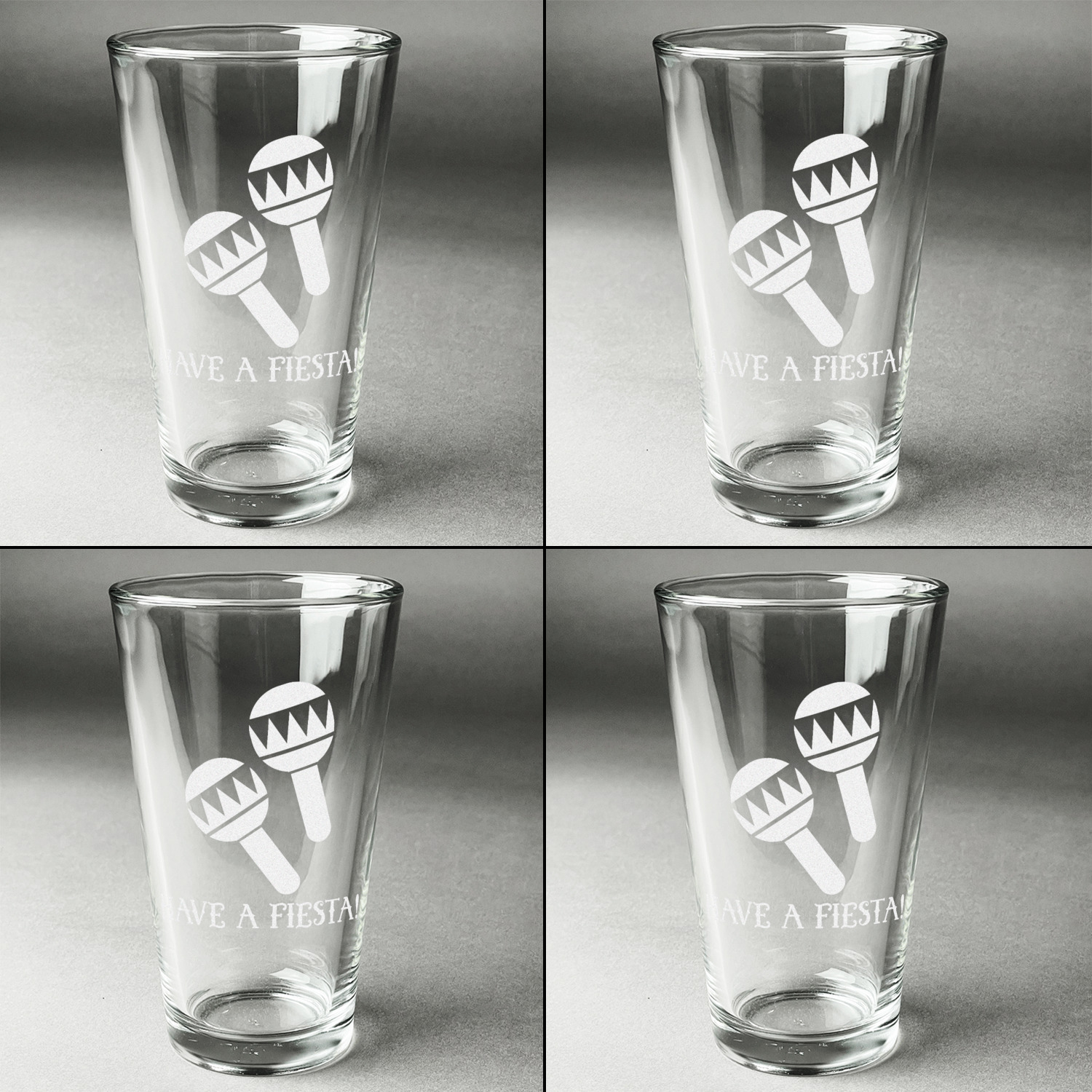 Available in a single glass or a set of 4 - each glass will be custom engraved with your design. Each glass holds 16 oz and measure 5.75"H x 3.5"W.