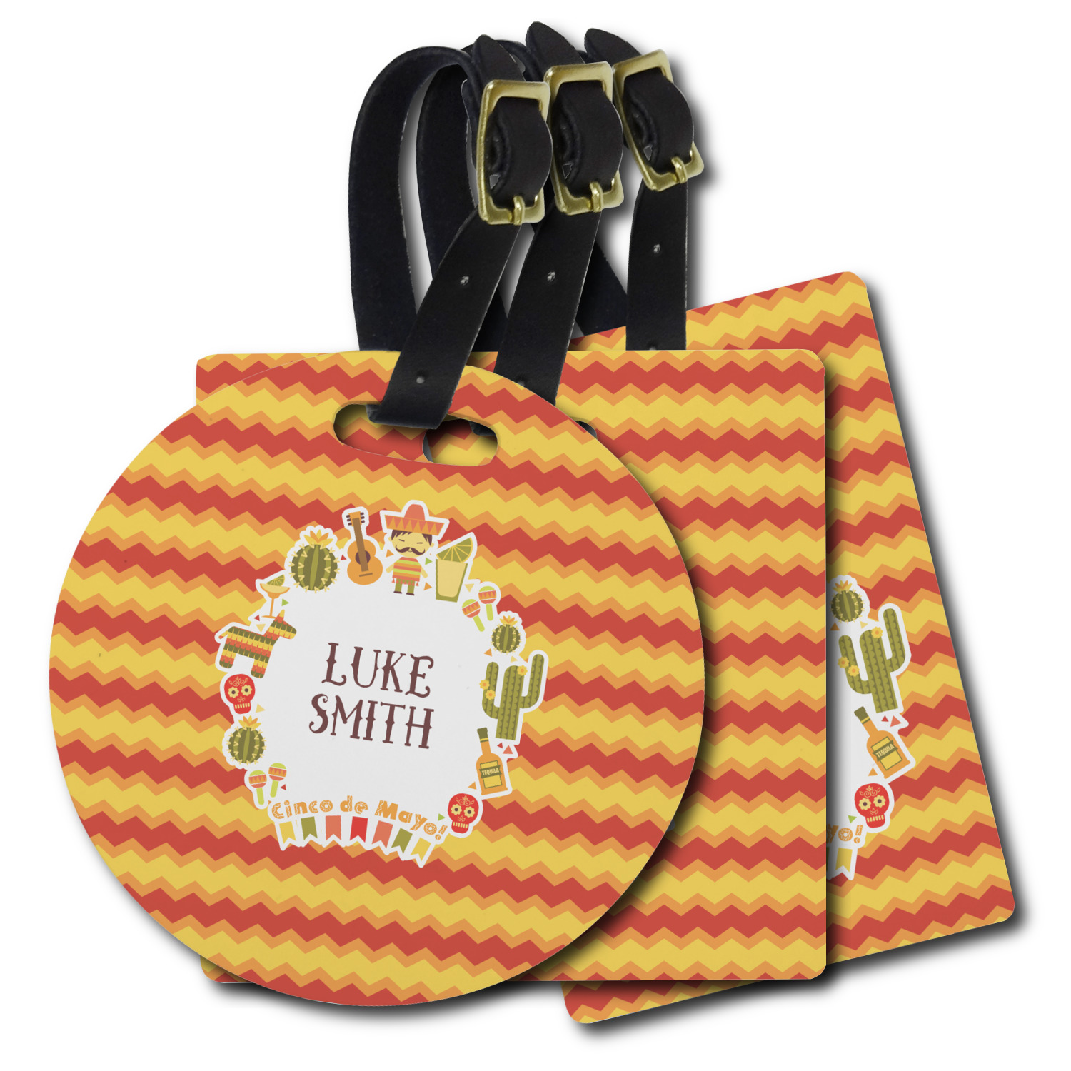 These personalized bag tags are sold in a variety of shapes, so that you may find the product that meets your vision exactly. We sell a round luggage tag, which measures at approximately 4" x 4". Our square luggage tag is about 3.5" x 3.5", while our rectangular version is 2.75" x 4 ".