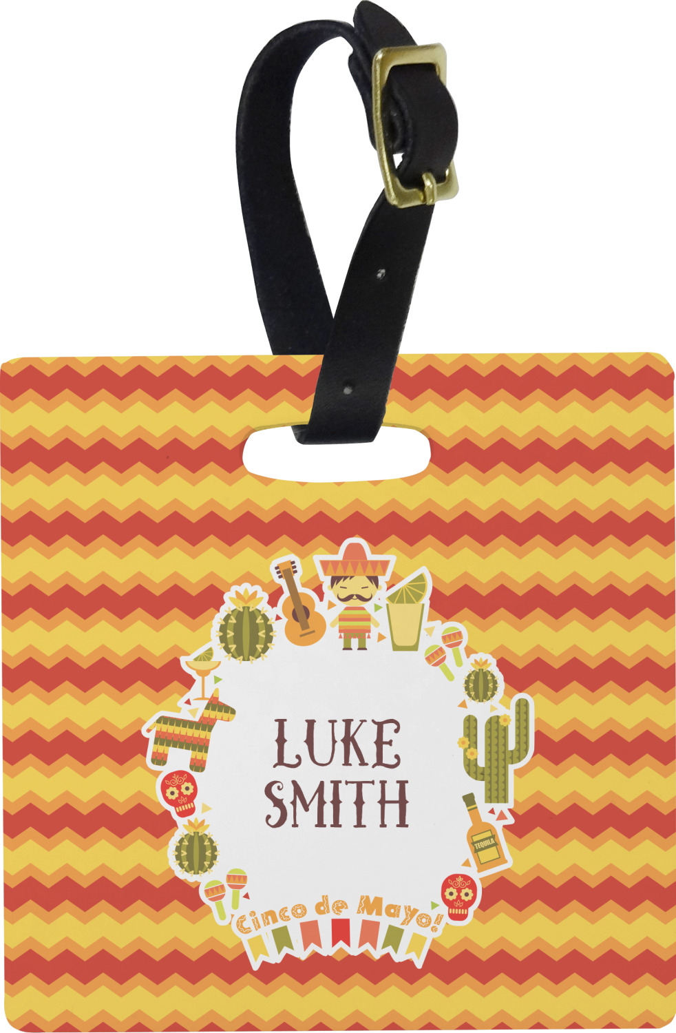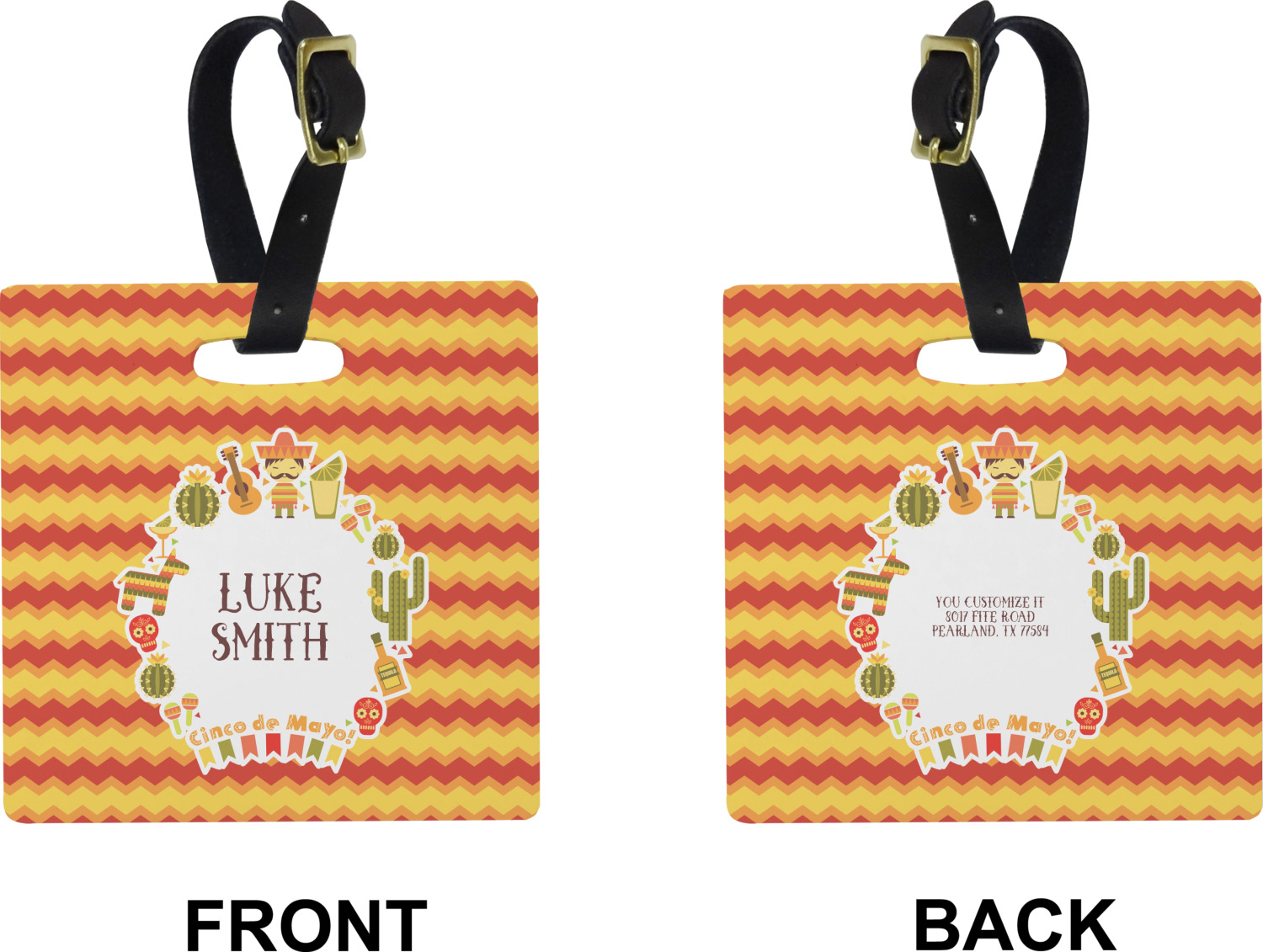 These personalized bag tags are sold in a variety of shapes, so that you may find the product that meets your vision exactly. We sell a round luggage tag, which measures at approximately 4" x 4". Our square luggage tag is about 3.5" x 3.5", while our rectangular version is 2.75" x 4 ".