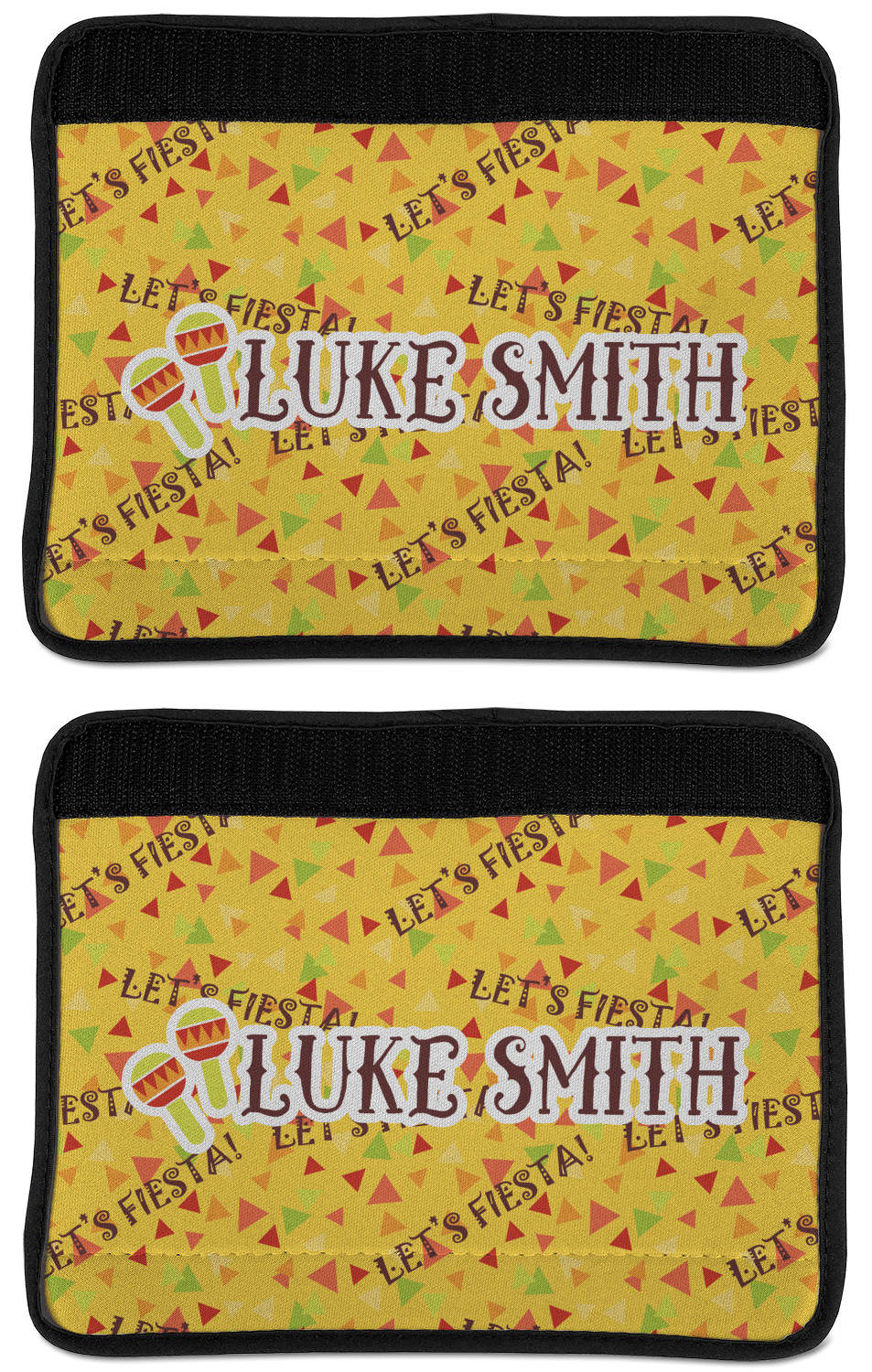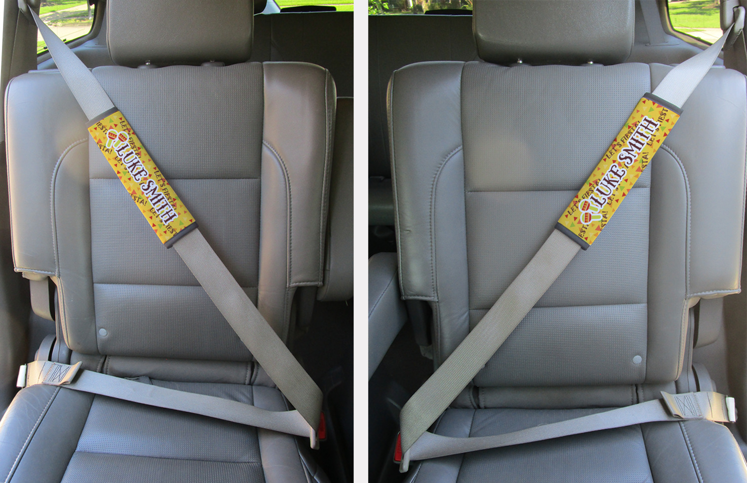 Made from neoprene, our seat belt strap covers wrap around the belt itself and have a Velcro tab for easy attachment and closure. The belt's edges are trimmed with a black polyester for a secure finish. Each cover is 9.5 by 7 inches when open and 9.5 by 2.5 inches when closed. We print your personalized design on the face of the seat belt pad.