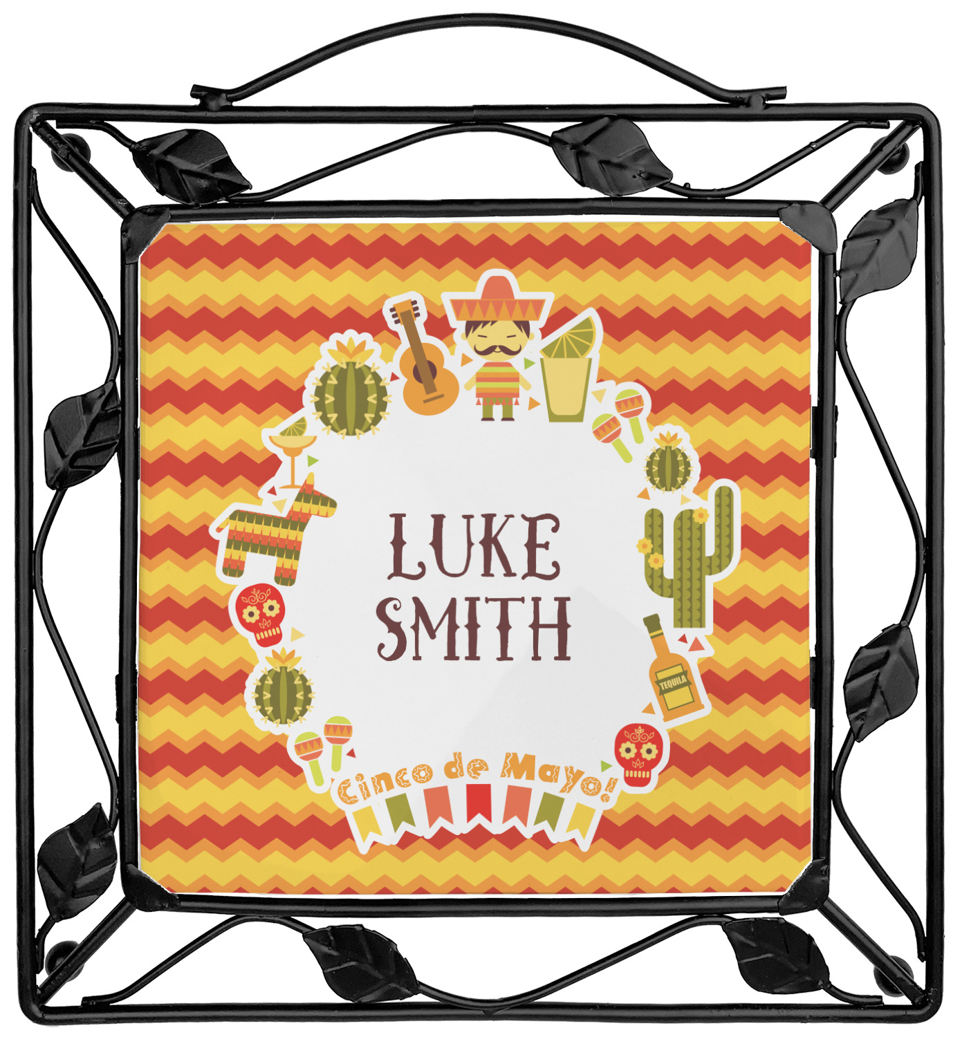 Our square trivets are made from a durable, wrought iron. This model features 4 small half circles, one on each corner, and a larger ring of iron that circles the central, customized tile. Each of the 4 corners has a round foot on its bottom for stability. This trivet is 8.75 by 8.75 inches, but the central tile measures at 6 inches on both sides.