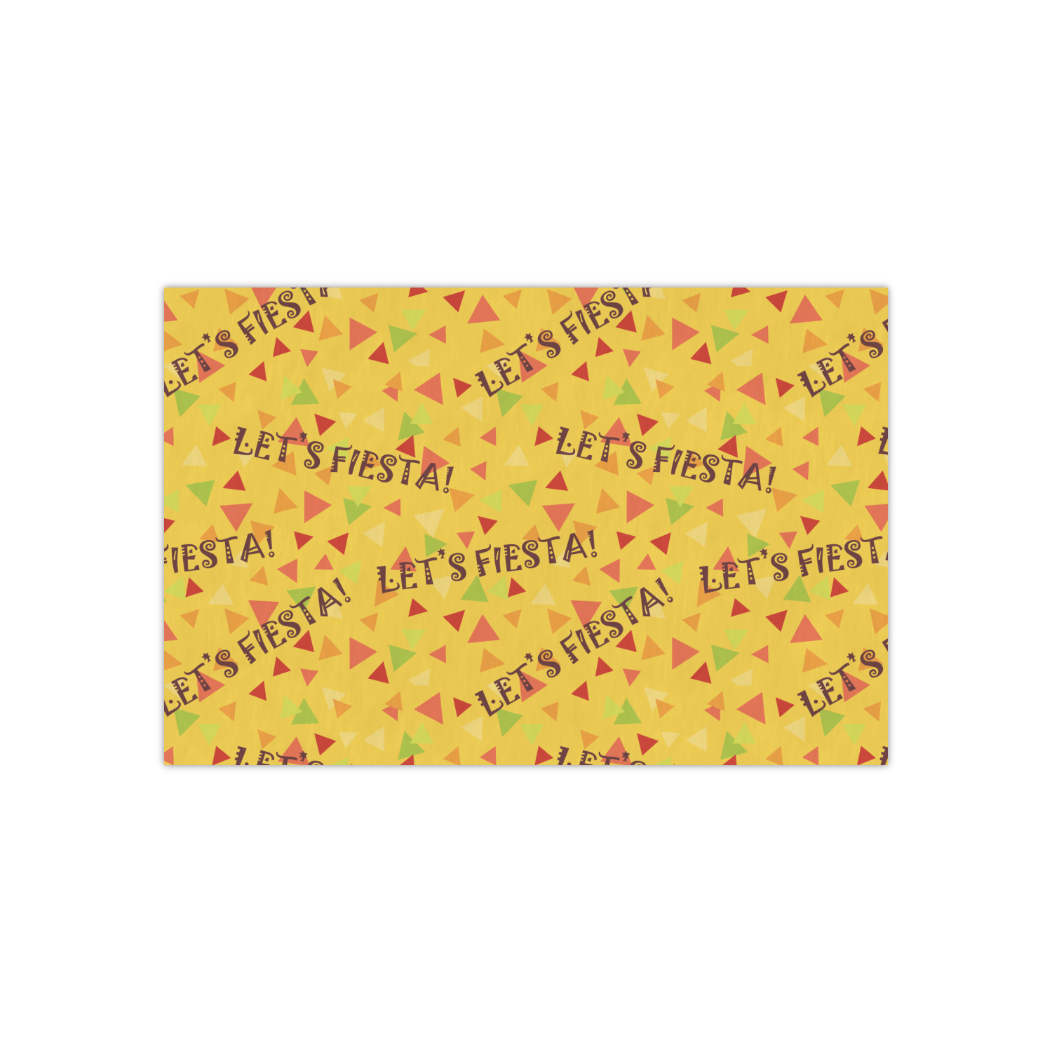 This design has many bright colors including red, orange, yellow, and green. The fun chevron gives a great pop to the fun frame that sits in the foreground. The frame has all kinds of fun illustrations like maracas, cacti, and even a mariachi man! The coordinating pattern has fun triangles all over with the phrase "Let's Fiesta!" all over as well. This really is the perfect design to get people hyped.