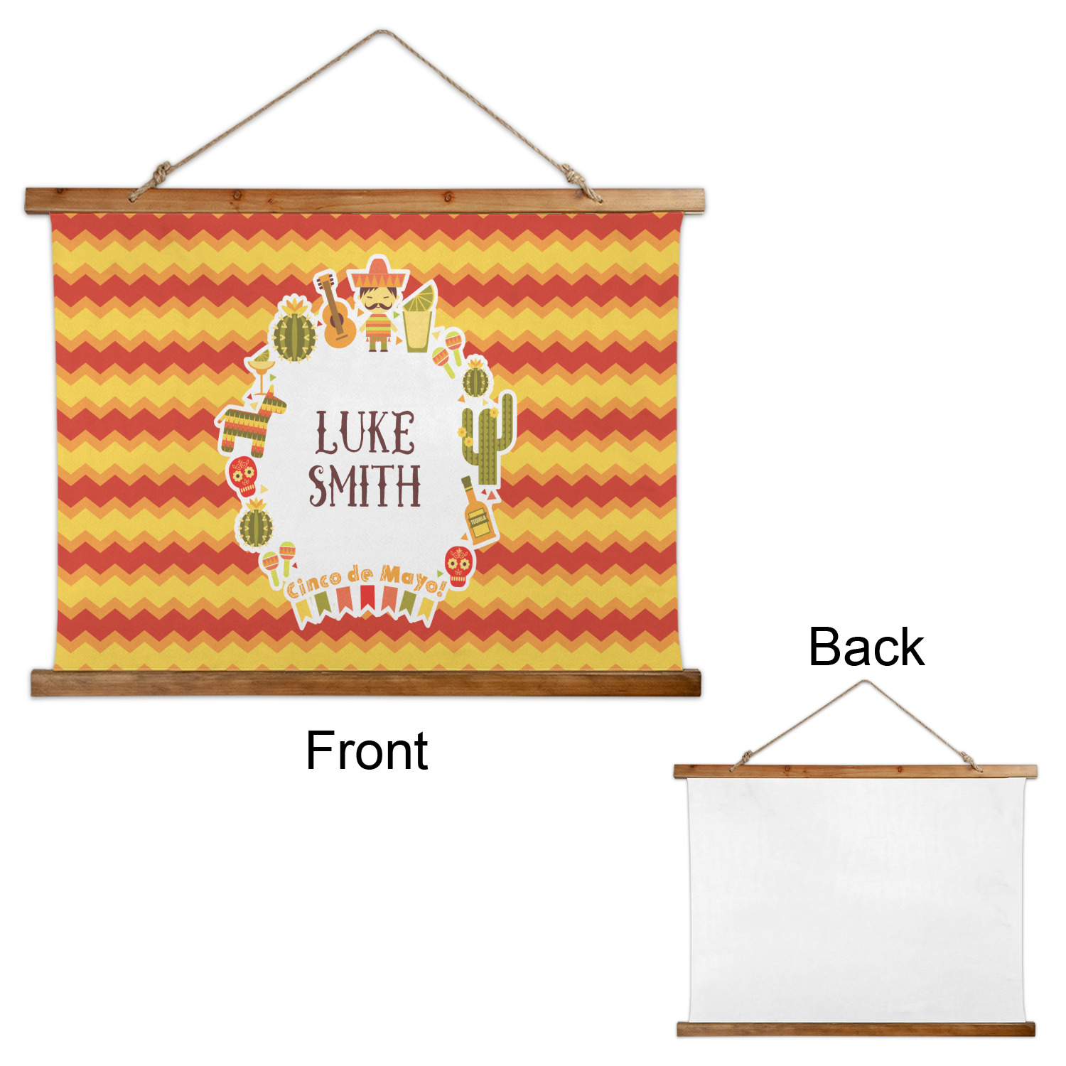 Made in two different orientations - portrait or landscape - both are 26" x 36". Your design is printed on a high quality polyester fabric with hemmed edges. The wood on the top and bottom of the tapestry is 1.25" tall and 0.25" thick and there are two pieces on top and bottom which sandwich the fabric.