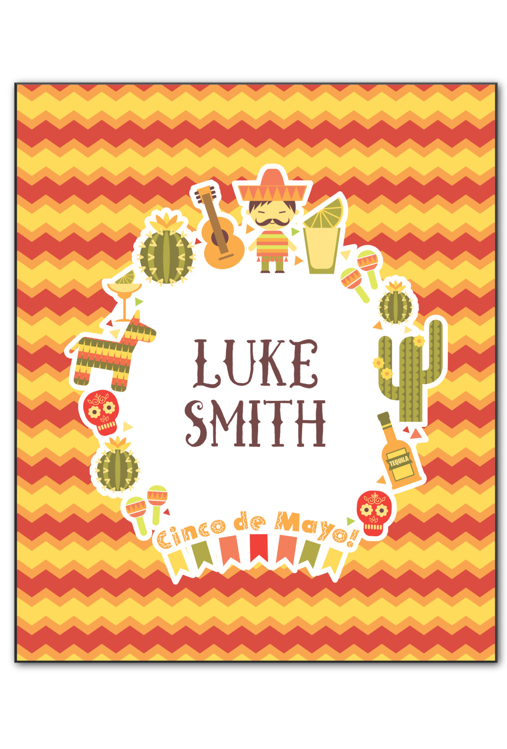This design has many bright colors including red, orange, yellow, and green. The fun chevron gives a great pop to the fun frame that sits in the foreground. The frame has all kinds of fun illustrations like maracas, cacti, and even a mariachi man! The coordinating pattern has fun triangles all over with the phrase "Let's Fiesta!" all over as well. This really is the perfect design to get people hyped.