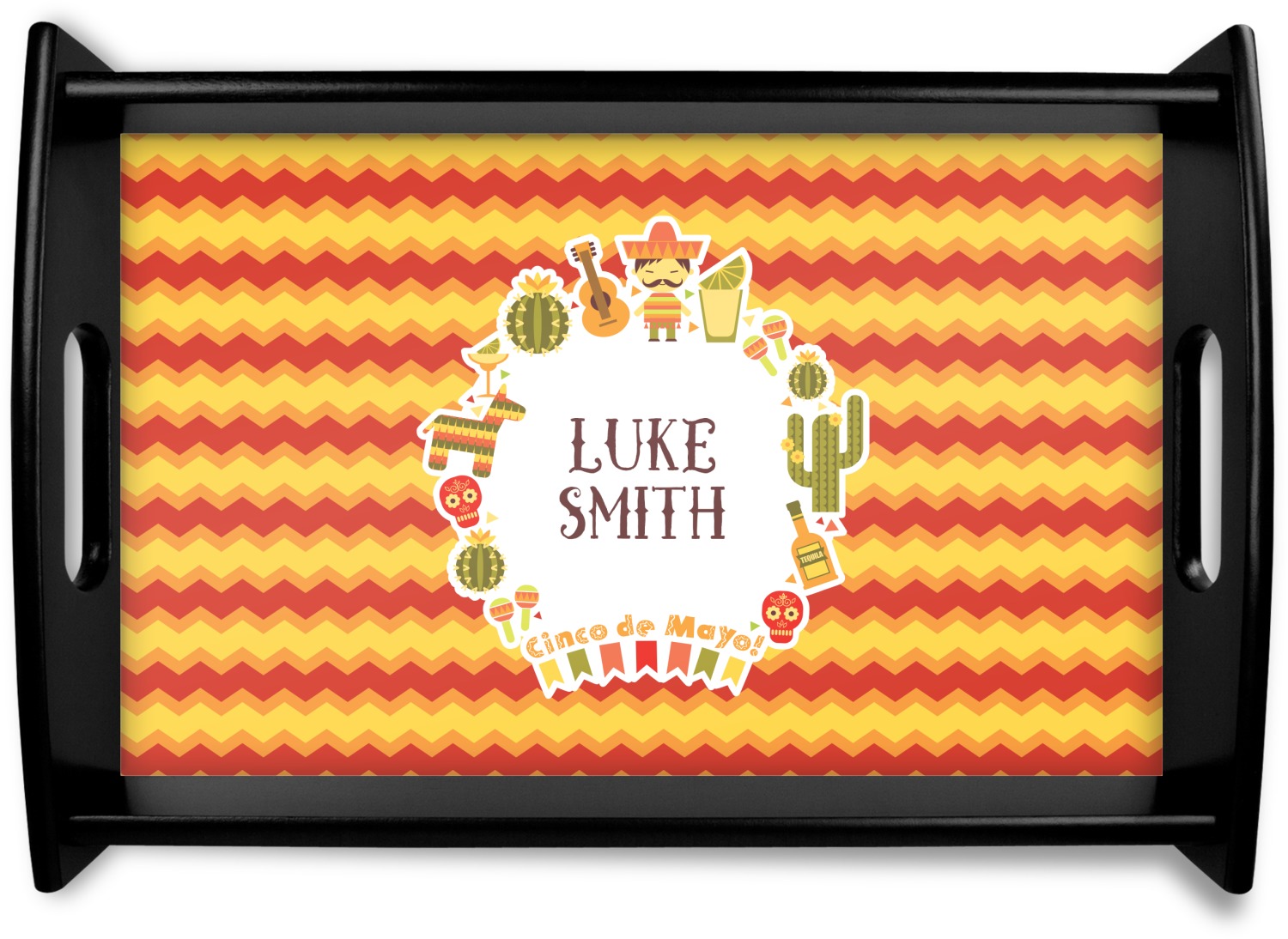 This serving tray with handles features square edges and two rounded sides, creating a very modern look. Each side is fabricated from a beautifully cut, natural wood. The bottom of the interior of the tray displays your customized design in bright, vibrant color. The tray is sold in both a black color and a natural wood look. Each variation of the wood serving tray has two sizes: Small, which is 14" x 10" x 2.25", and Large, which is 19.5" x 13.5" x 2.75".