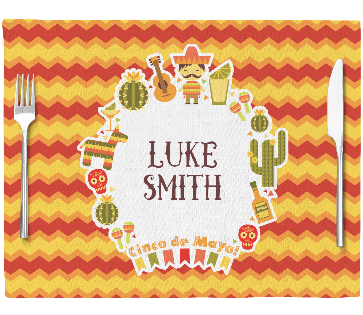 This design has many bright colors including red, orange, yellow, and green. The fun chevron gives a great pop to the fun frame that sits in the foreground. The frame has all kinds of fun illustrations like maracas, cacti, and even a mariachi man! The coordinating pattern has fun triangles all over with the phrase "Let's Fiesta!" all over as well. This really is the perfect design to get people hyped.
