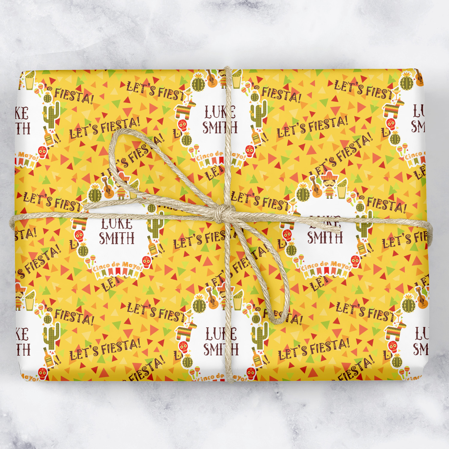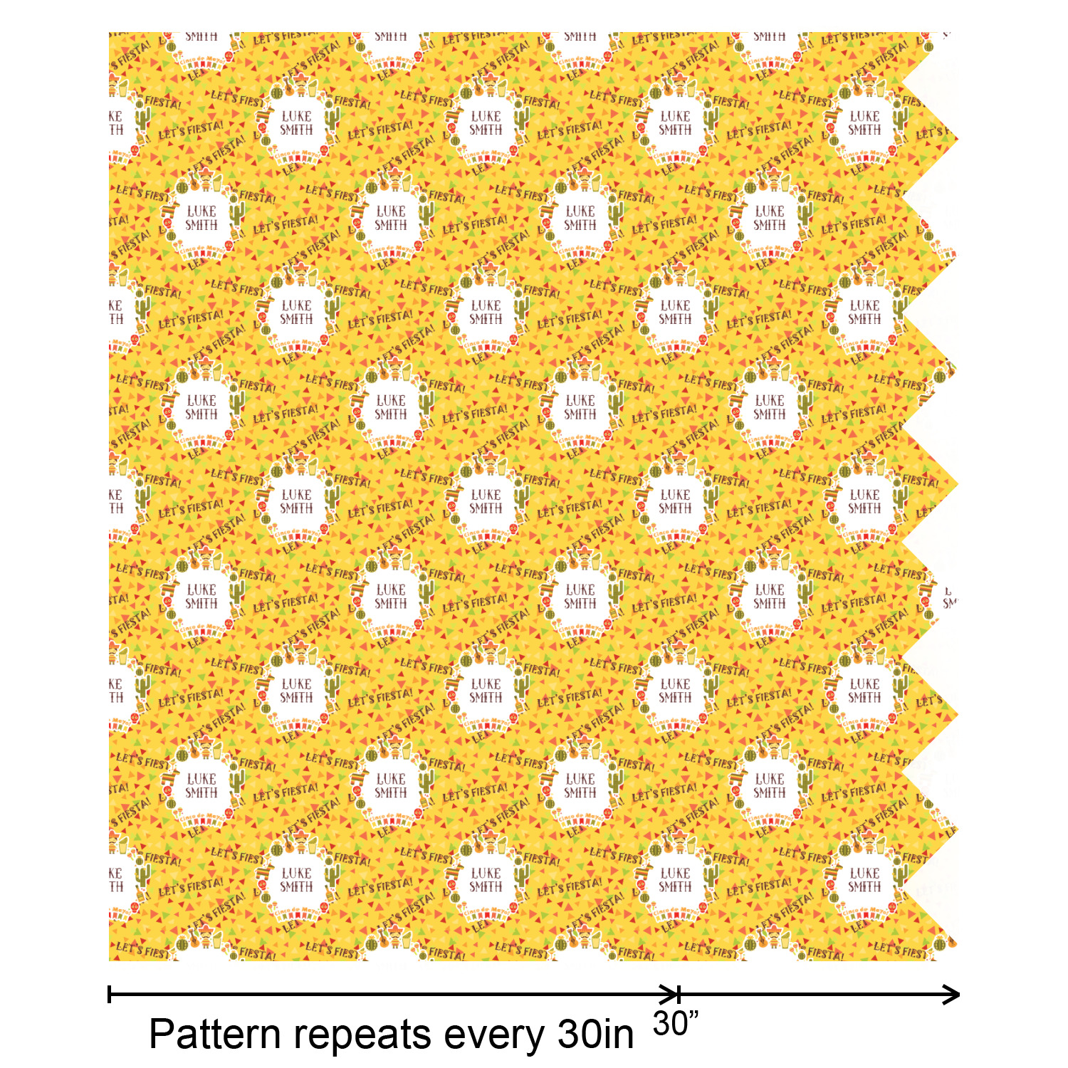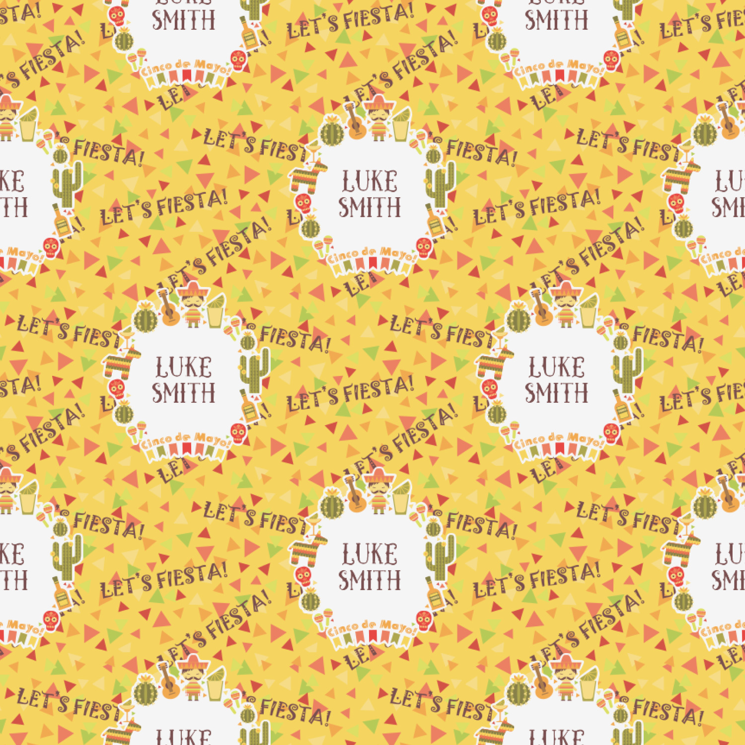 This design has many bright colors including red, orange, yellow, and green. The fun chevron gives a great pop to the fun frame that sits in the foreground. The frame has all kinds of fun illustrations like maracas, cacti, and even a mariachi man! The coordinating pattern has fun triangles all over with the phrase "Let's Fiesta!" all over as well. This really is the perfect design to get people hyped.
