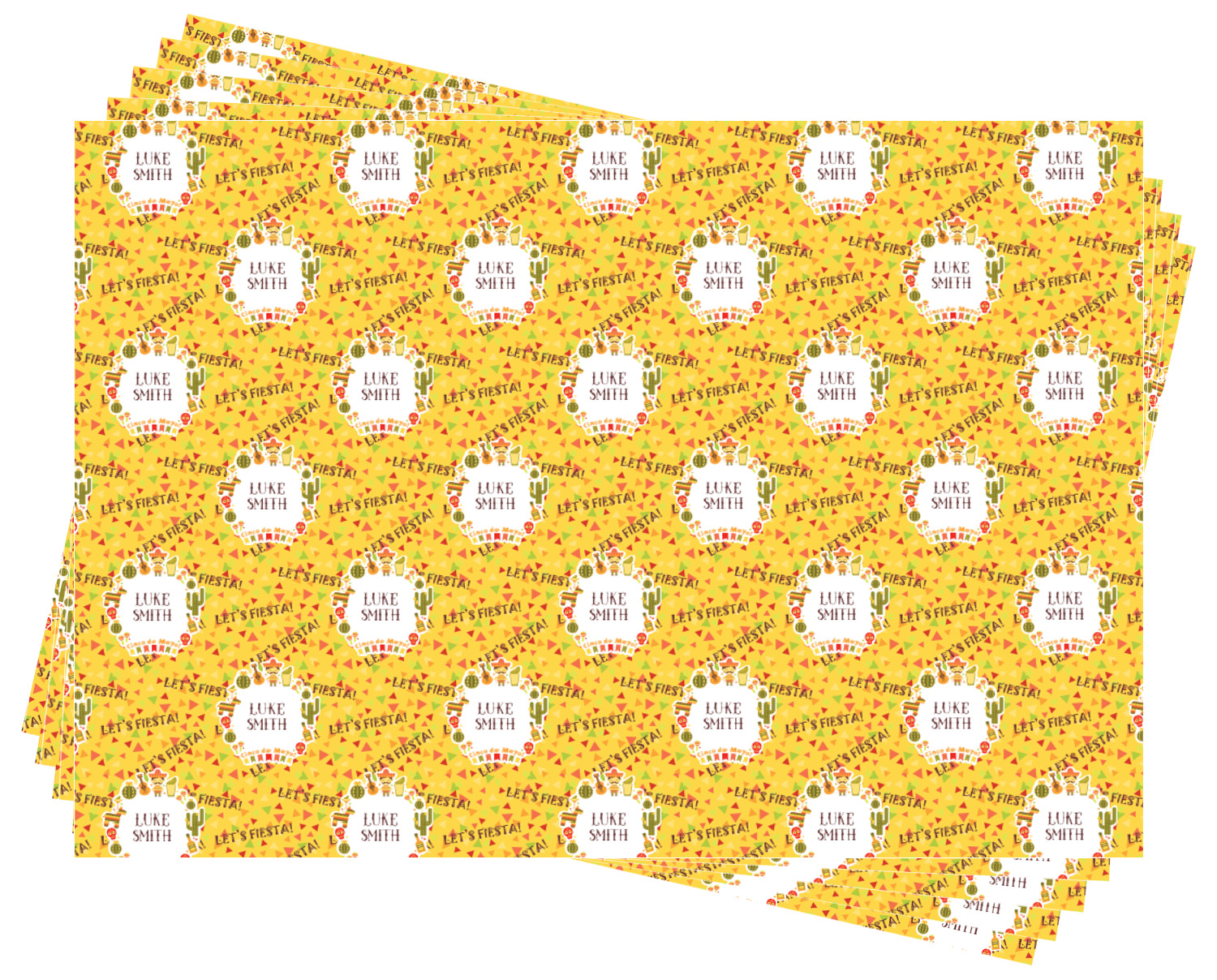 This design has many bright colors including red, orange, yellow, and green. The fun chevron gives a great pop to the fun frame that sits in the foreground. The frame has all kinds of fun illustrations like maracas, cacti, and even a mariachi man! The coordinating pattern has fun triangles all over with the phrase "Let's Fiesta!" all over as well. This really is the perfect design to get people hyped.