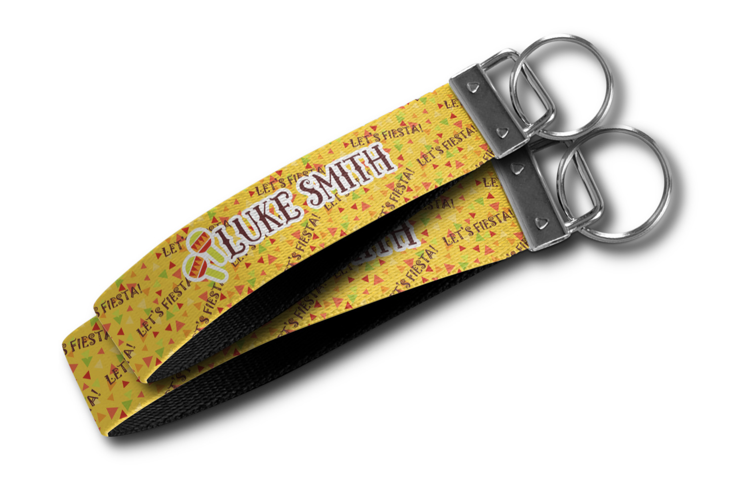 These key fob keychains are made from a polyester weave, right here in the USA. They feature a silver, metal clasp, attached to a round keyring. The piece gives the personalized wristlet a beautiful, finished look. Your customized design is printed on the outside of the keychain strap. We carry these wristlets in two sizes: small, which is 5 inches in width, and large, which is 5.5 inches in width.