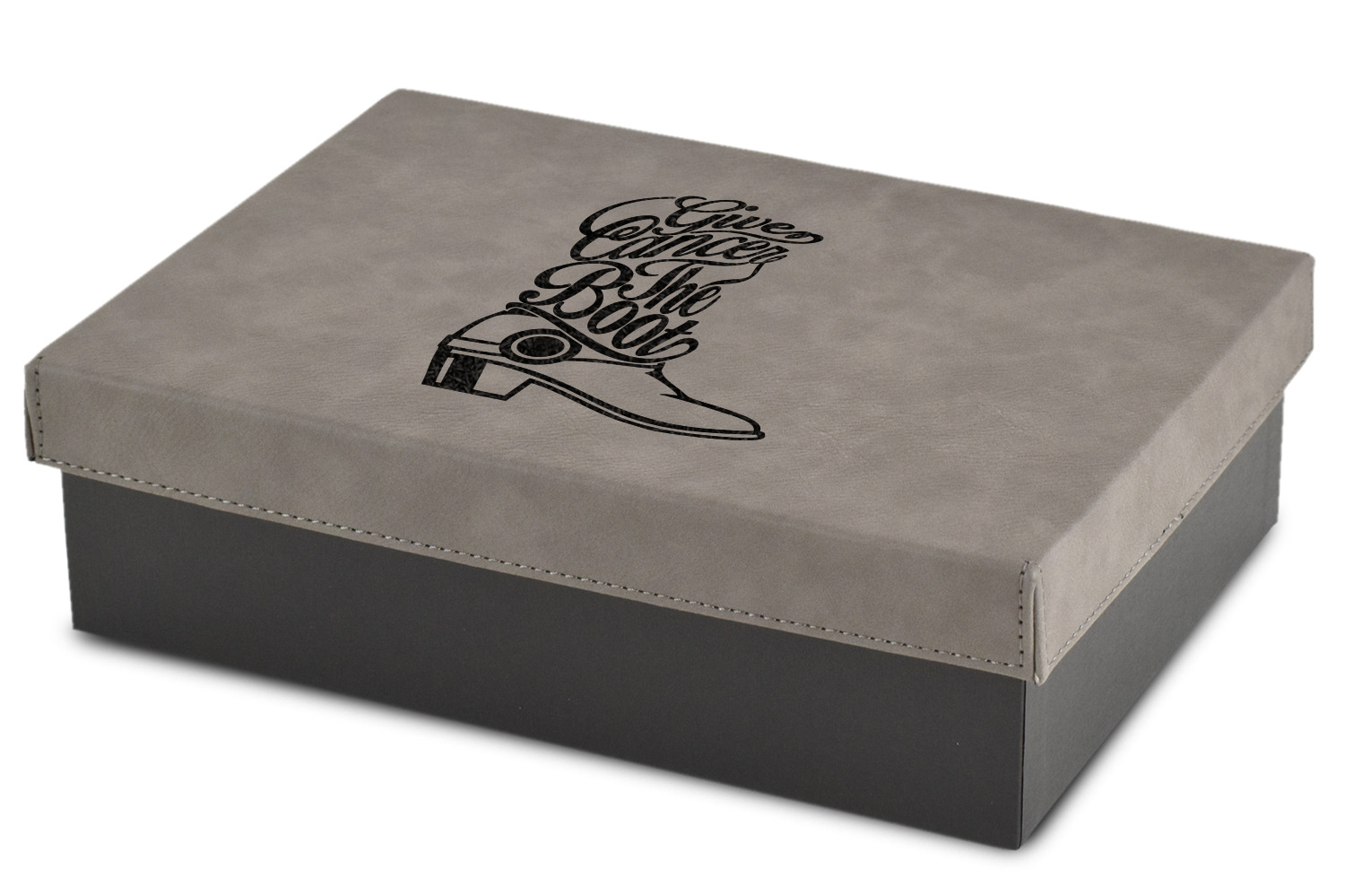 These gift boxes are available in 3 different sizes to accommodate various sized gifts. Available in gray as a neutral color for any occasion as well as to showcase your design boldly. Engraved with a laser this high quality paper board and faux leather gift box is unique and makes any gift stand out.
