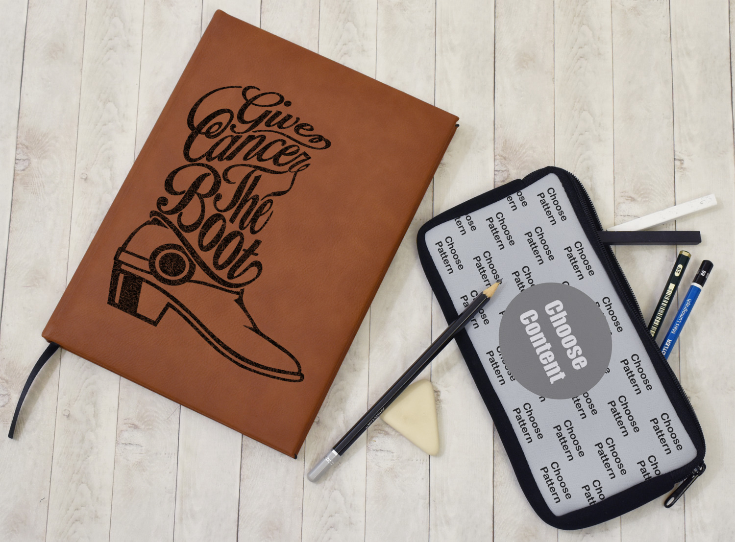 The faux leather covers are a rich cognac / rawhide color and can be customized with your design. From a simple name or monogram or a logo to a detailed mandala - the choice for customization & personalization is truly yours. Customize one of our designs or upload your own.