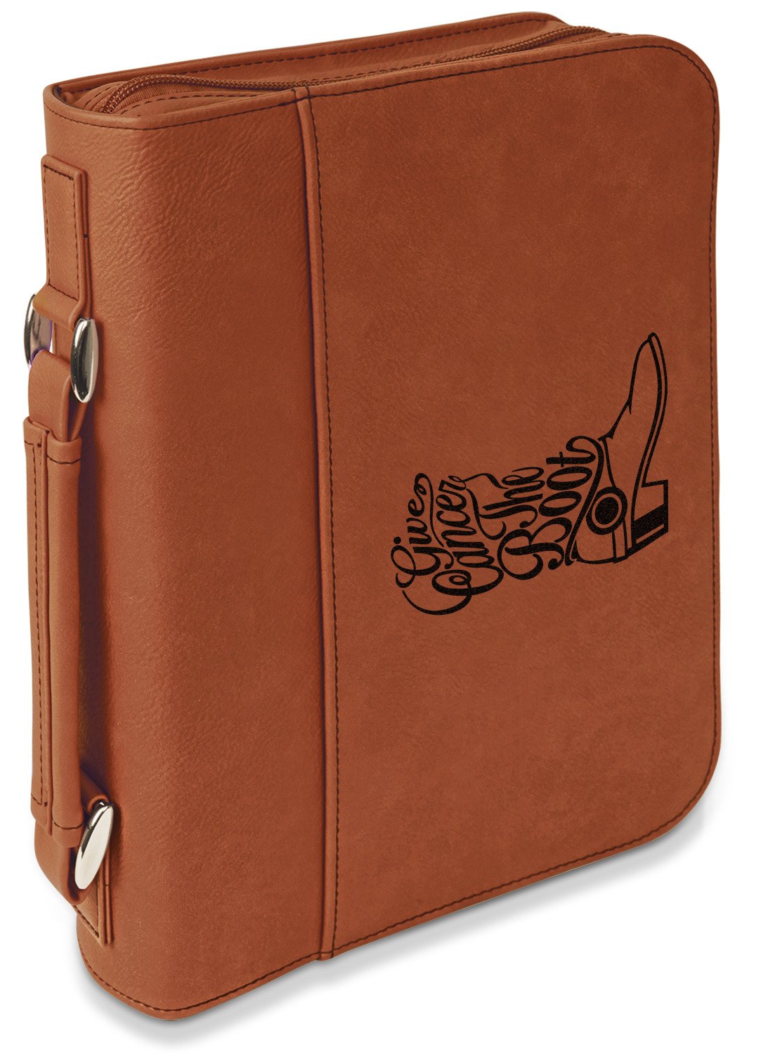 These book covers are fabricated from a fine leatherette in a warm, cognac shade of brown. A wide pocket spans across the front of the book jacket [2,400] and can store any loose papers or notes that you wish to keep. The interior of this personalized Bible cover includes slots on both sides to house the covers of your Bible, and keep it in place. The inside of the spine has a small elastic band to secure a pen. A zipper lines three sides of the cover, while the fourth side features a reinforced handle that allows for easy transport of your enclosed book.