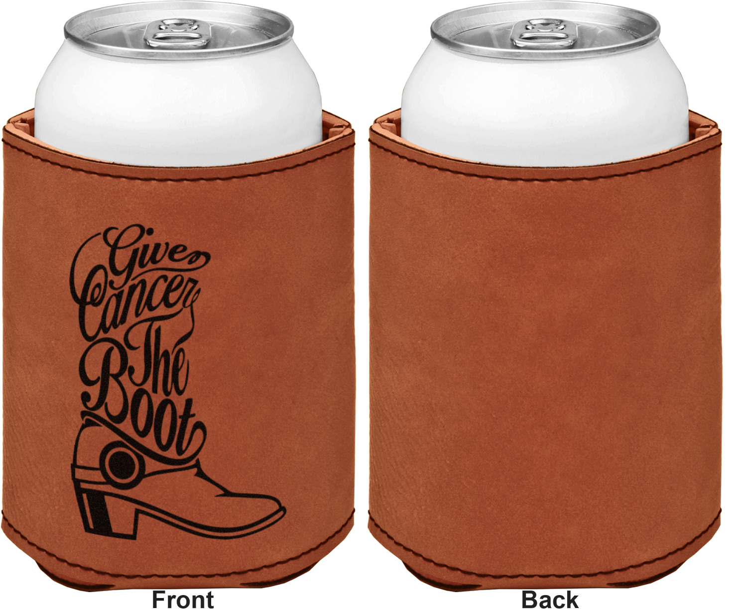 This can sleeve is made from a cognac-brown leatherette and stitched with a sturdy, black thread. A slim padding lines the inside of your can sleeve to allow for a better fit once your drink is inserted. The sleeve itself measures at 4 by 4.5 inches, allowing this custom can sleeve to accommodate most canned drinks. Your personalized design can be engraved on the front and back, or solely the front. When laser-engraved, your design appears as a black coloration which contrasts the leatherette nicely.