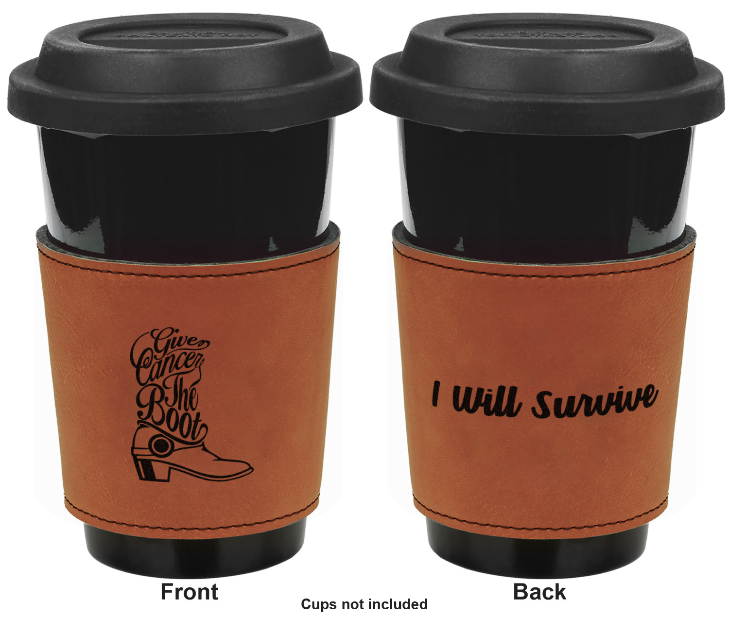 This cup sleeve is made from a suave, cognac-brown leatherette and finished with an intricate, black stitch. The interior of this can sleeve is fabricated from a thin foam material to help insulate your mug's contents. The sleeve is specifically made to suit tapered glasses or mugs, so the top's diameter is 3.5 inches, while the bottom's diameter is 2.75 inches. Your customized design will be laser engraved into the leatherette, leaving behind crisp, black imprint. With these products, we provide you with the option of engraving the front and back, or the front only.