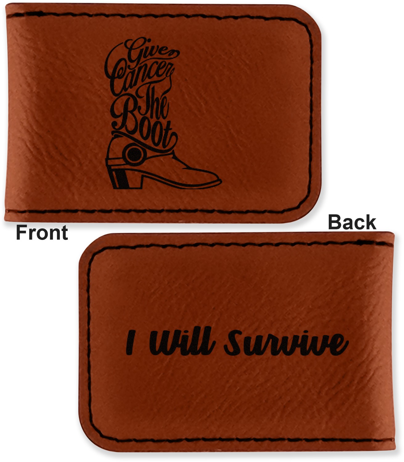 Your money clip will be laser engraved so that the design you choose will come out black. Find a fun graphic, monogram, or font to use to personalize your money clip either on just the front or the front and the back.