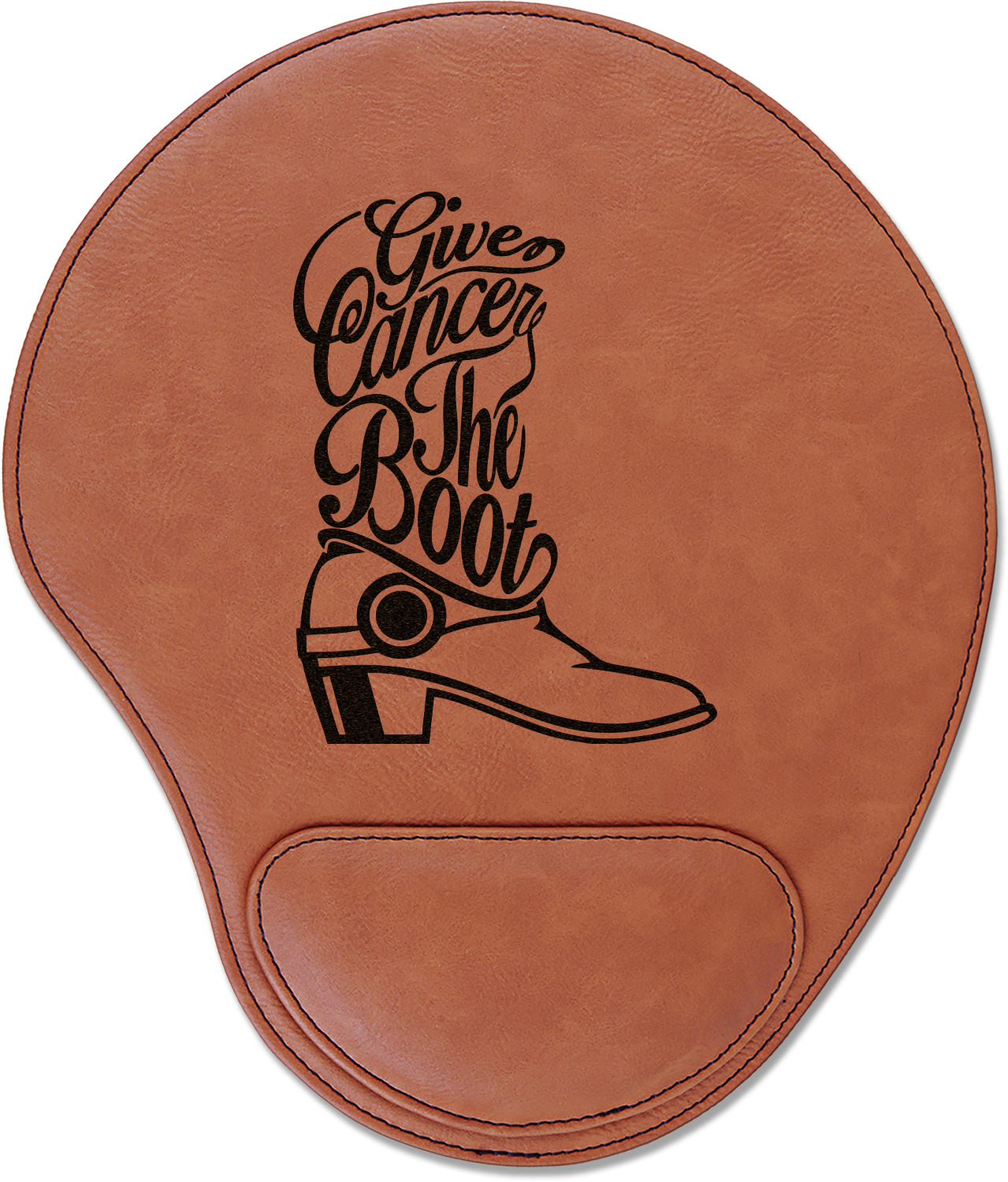 In a rounded shape, this mouse pad is made of a luxurious, cognac-colored leatherette. The nature of this material allows your mouse to glide smoothly across its surface. Strong stitching lines the edges to guarantee stability and strength. As added support for tired wrists, your personalized mouse pad features a supportive wrist rest at its bottom. This model measures at 10.25" x 9", while its wrist pad is approximately 5" x 2.75", with a thickness of 0.75". Your personalized design is laser engraved into the front face of this mouse pad.