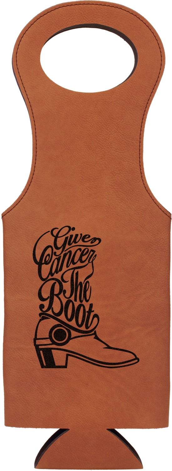 This wine carrier is made from a stunning leatherette, in a cognac-brown color. Strong, black stitching lines the sides of your wine bottle bag and provides extra durability. The interior is lined with a padded, black material to allow for a snug fit once your bottle is placed inside. At the top of this wine gift bag, you'll find two oval shaped handles that elegantly complements the rest of the bag's style. We provide you with the option of laser-engraving the front, or the front and back of your new personalized wine bag!