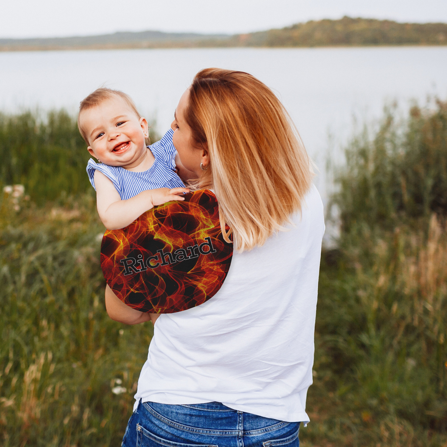 Both our baby bib and burp pad are made up of soft, microfiber velour with a cotton backing. The comfortable and plush material of our bib and burp set is perfect for both baby and parent. We print your design on the microfiber velour face fabric with baby safe ink on your customizable bib and burp cloth to ensure safety for the little one! Our drool bib also comes with a Velcro clasp for safe and easy wear while the burp cloth is a unique peanut shape that perfectly hugs over the shoulder.