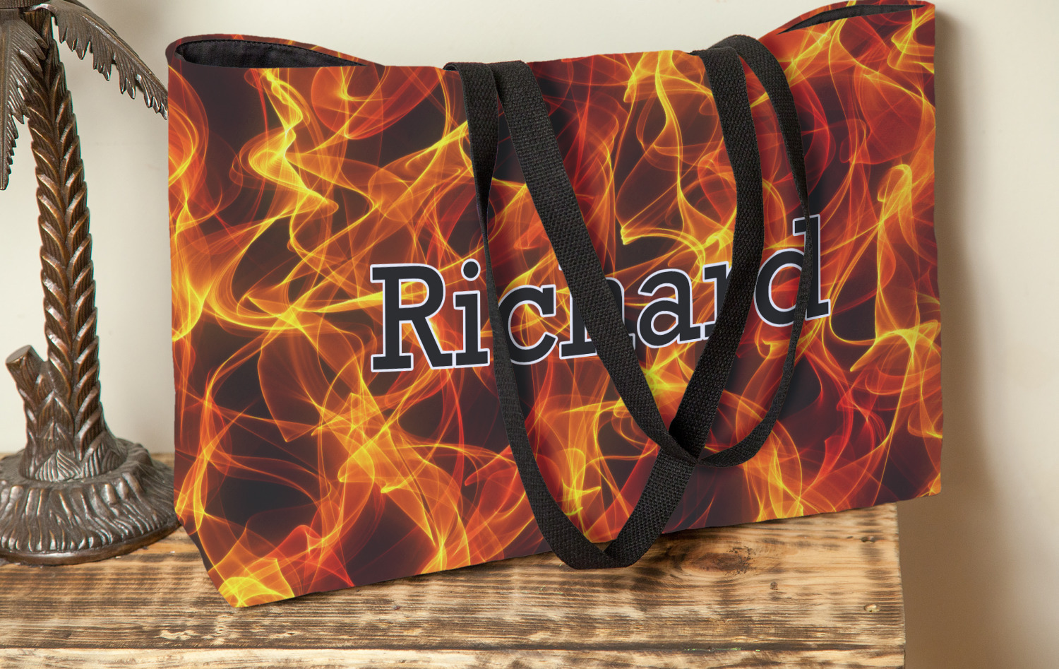 These beach totes are handmade here in the USA. Fabric is printed with your design. The tote is then sewn from the fabric pieces, lining and handles added.