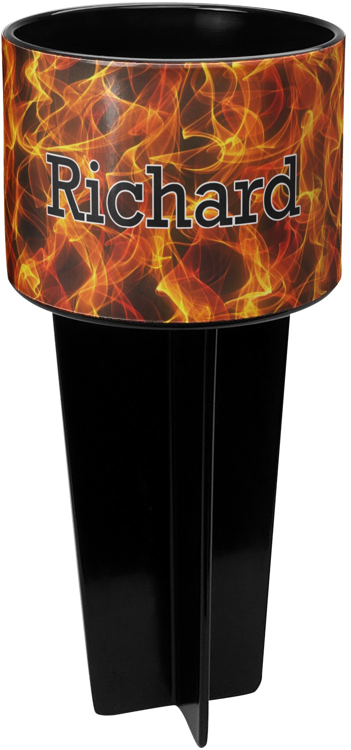 This cup holder has a large stake at its bottom that anchors it to the sand or ground below, while the cup holder rests above the stake. The entire drink holder is made of durable plastic and displays your customization around the cup holder portion. We sell these personalized beach spikers in two different colors: black and white.