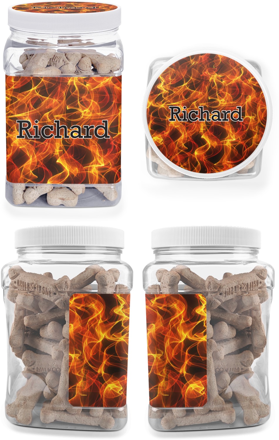 This half gallon jar, made from a sturdy plastic, is the perfect way to keep treats from any naughty pet paws, while still keeping them ready on hand for when your pup performs an impressive trick. This dog cookie jar features a screw-on, white lid that displays your personalized design on a vinyl sticker. We apply another customized sticker that wraps around the front and sides of the jar. Our dog treat jar also has indentations on the rear ends of the sides, which allows for convenient handling, and its square frame allows for easy storage.