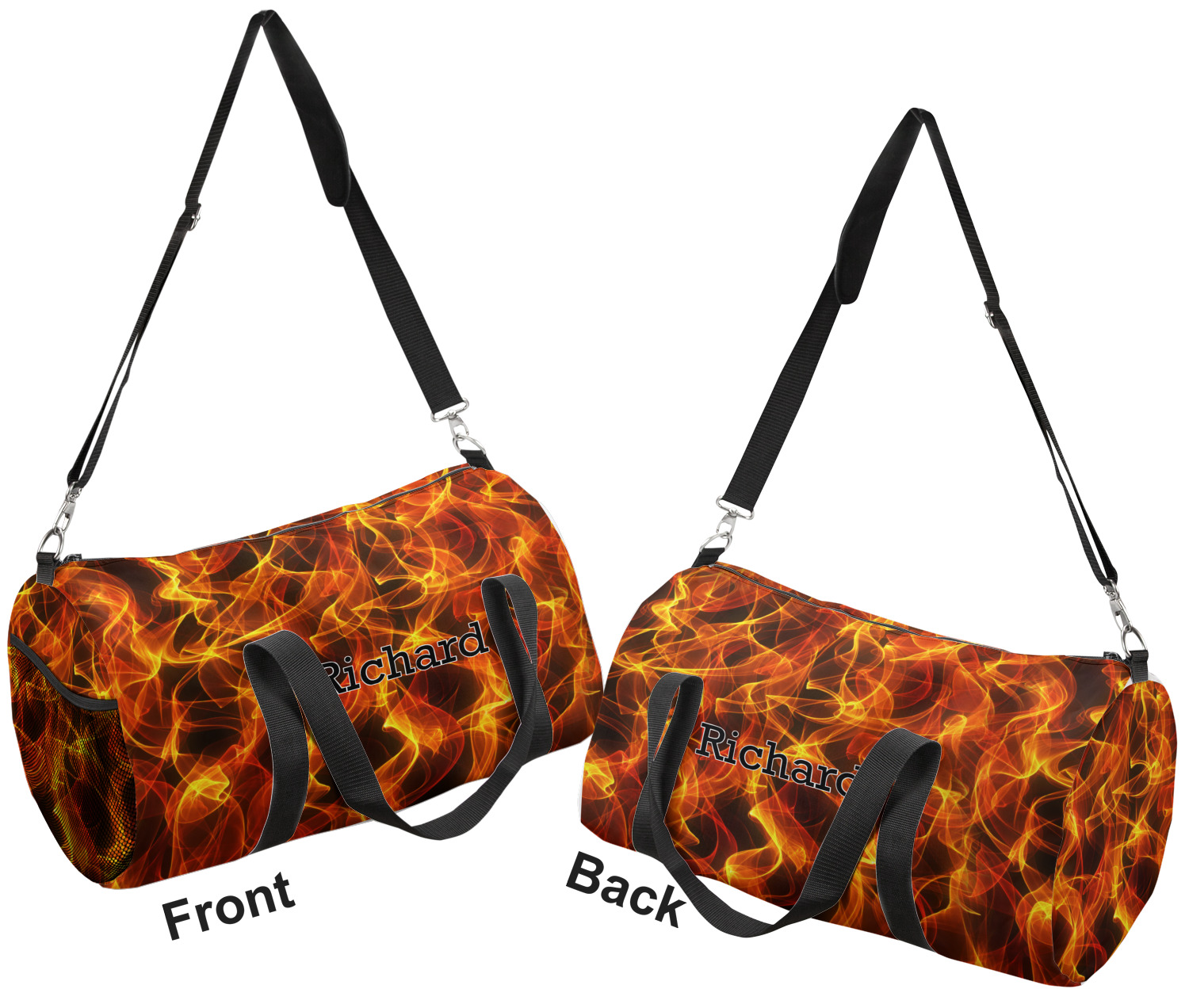 This duffle is a sturdy bag made of a canvas material. It comes in two sizes: Small (19"W x 9.5"H x 9.5"D) and Large (23"W x 12"H x 12"D). The bag is a cylindrical shape with a black adjustable strap and two handles. On one side is an elastic pouch to put a waterbottle or other small item. Your product will be sublimated with your design and is able to be designed on the front, back, and sides. Be sure to remember that the straps may cut into parts of your design if you upload your own artwork.