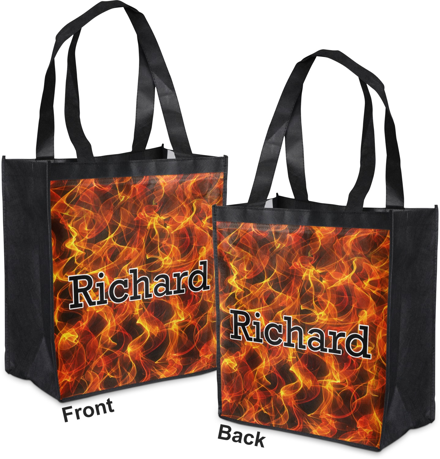 Made from a durable, biodegradable material, these reusable shopping bags can support up to 30 pounds of weight. With two large handles, measuring at 8.5 inches each, these personalized tote bags are easy to carry to your vehicle or home. The bag itself is 12 by 13.5 inches, and can expand to a depth of 7 inches. Your customization is printed on both the front and back, while the remaining sides, trim, and handle are a sleek, charcoal black.