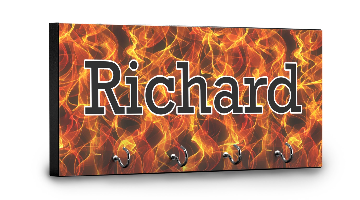 This 11" x 5" key hanger is made of sturdy wood and has four metal hooks lining the bottom. This is the perfect size for a family with several drivers. Not only can you hang keys on it though, but pet leashes and other small items. The board is black on the sides and back and is printed with the design of your choice on the front.