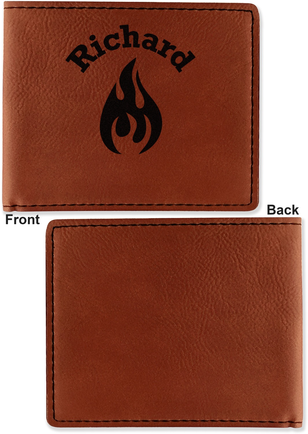 Your bifold wallet will be personalized by laser engraving, which will be a black color on the wallet. Choose a graphic, text, or monogram to personalize your wallet. There are thousands of choices in our design center.