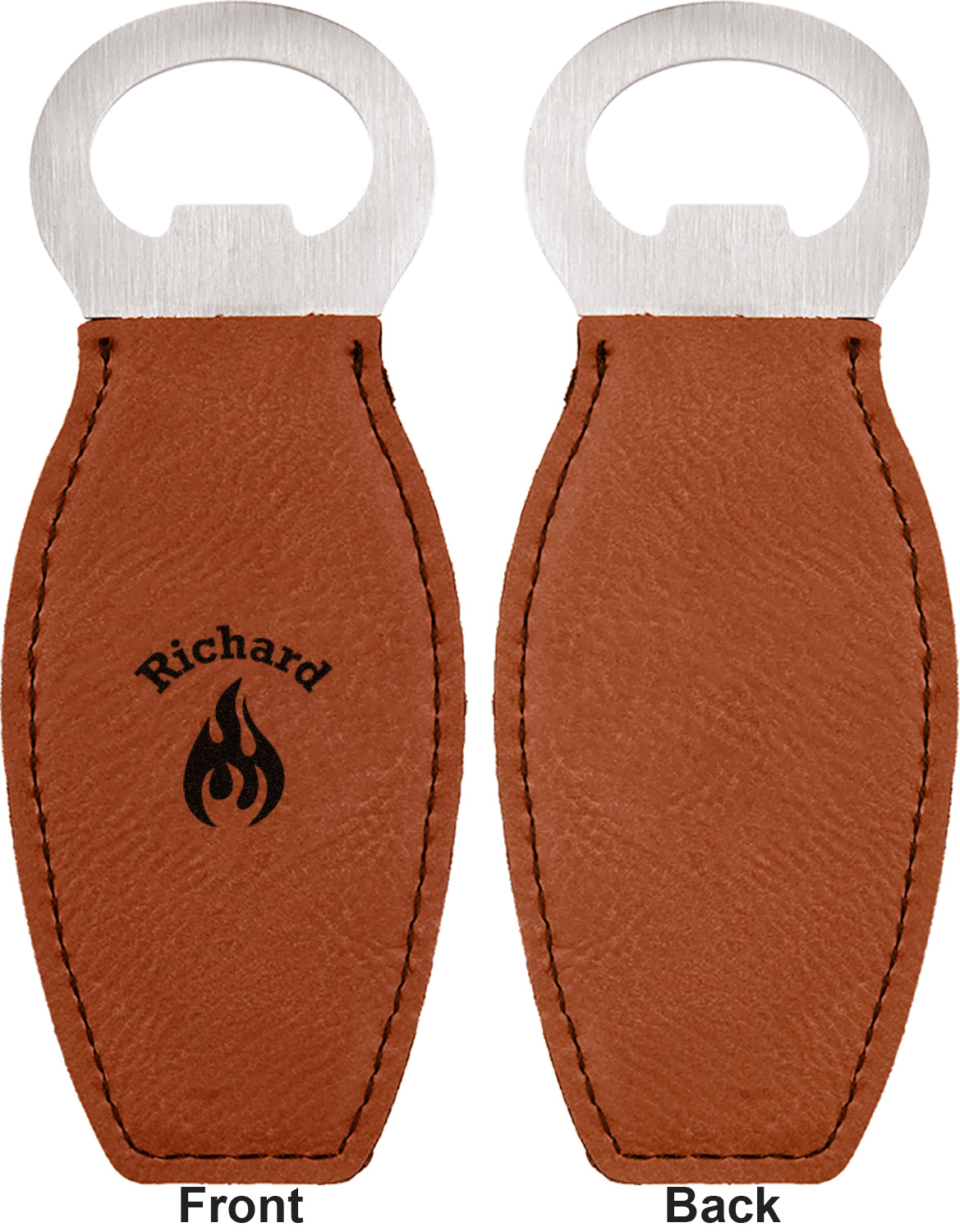 Built from stainless steel, these custom bottle openers are wrapped in a cognac-colored leatherette. Sharp, black stitching lines the edges for extra durability and a finished touch. Your personalization is laser-engraved onto the surface of this leatherette, leaving behind a crisp, black coloration. At 4.6 by 1.8 inches, this beer bottle opener gives you much of leverage when trying to open a stubborn bottle. On the opposite end of the opener, you'll find a magnet that you can use to display your new, unique bottle opener!