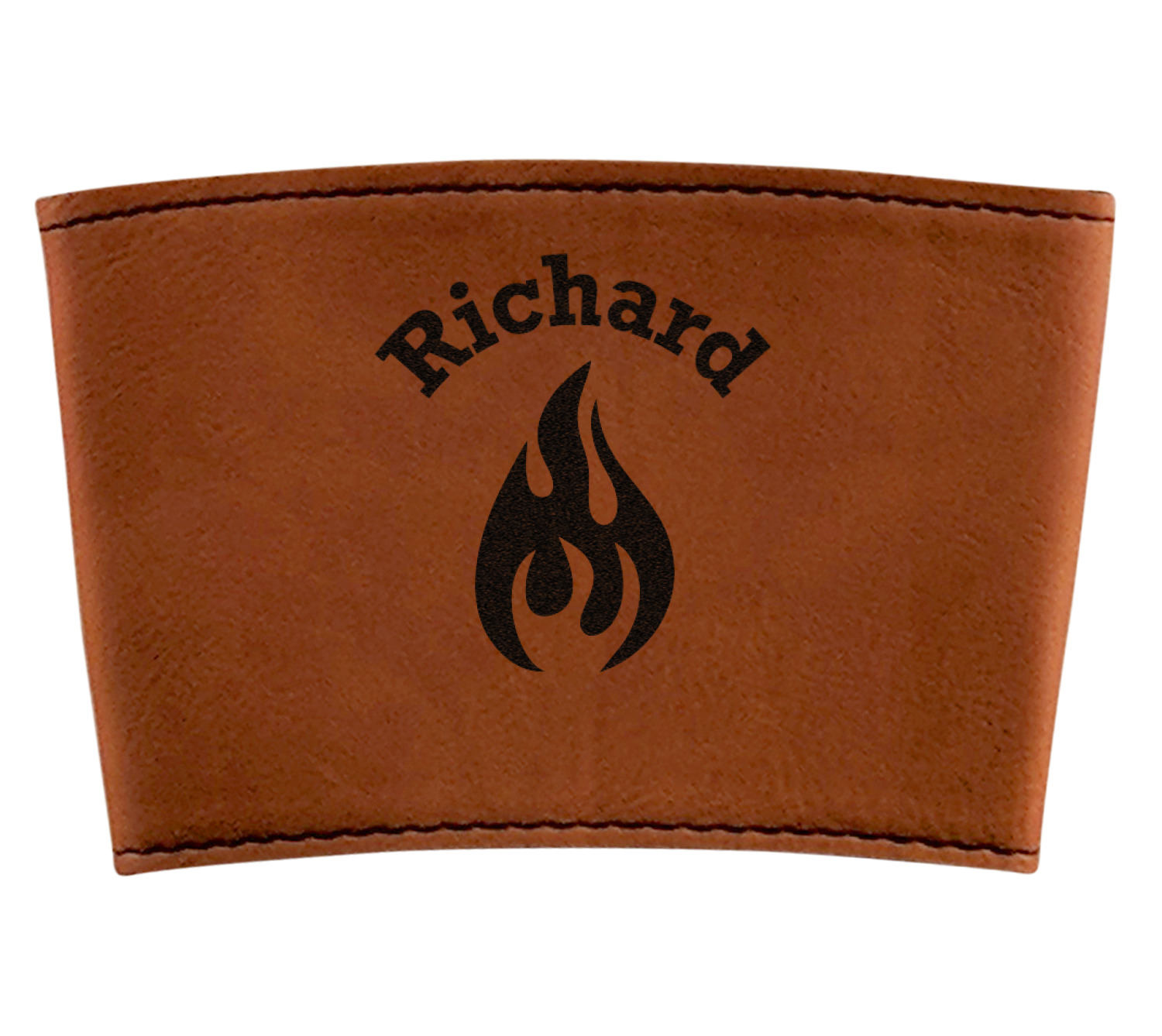 This cup sleeve is made from a suave, cognac-brown leatherette and finished with an intricate, black stitch. The interior of this can sleeve is fabricated from a thin foam material to help insulate your mug's contents. The sleeve is specifically made to suit tapered glasses or mugs, so the top's diameter is 3.5 inches, while the bottom's diameter is 2.75 inches. Your customized design will be laser engraved into the leatherette, leaving behind crisp, black imprint. With these products, we provide you with the option of engraving the front and back, or the front only.