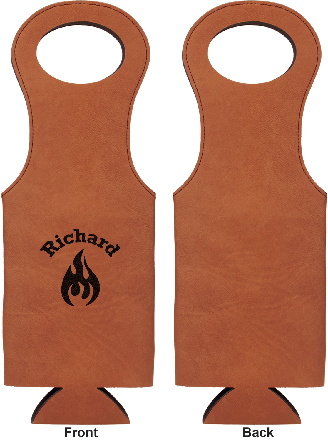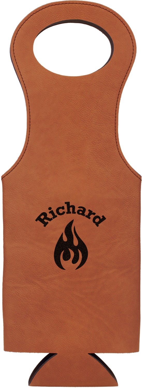 This wine carrier is made from a stunning leatherette, in a cognac-brown color. Strong, black stitching lines the sides of your wine bottle bag and provides extra durability. The interior is lined with a padded, black material to allow for a snug fit once your bottle is placed inside. At the top of this wine gift bag, you'll find two oval shaped handles that elegantly complements the rest of the bag's style. We provide you with the option of laser-engraving the front, or the front and back of your new personalized wine bag!