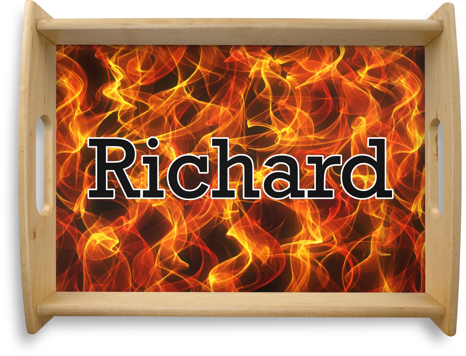 This serving tray with handles features square edges and two rounded sides, creating a very modern look. Each side is fabricated from a beautifully cut, natural wood. The bottom of the interior of the tray displays your customized design in bright, vibrant color. The tray is sold in both a black color and a natural wood look. Each variation of the wood serving tray has two sizes: Small, which is 14" x 10" x 2.25", and Large, which is 19.5" x 13.5" x 2.75".
