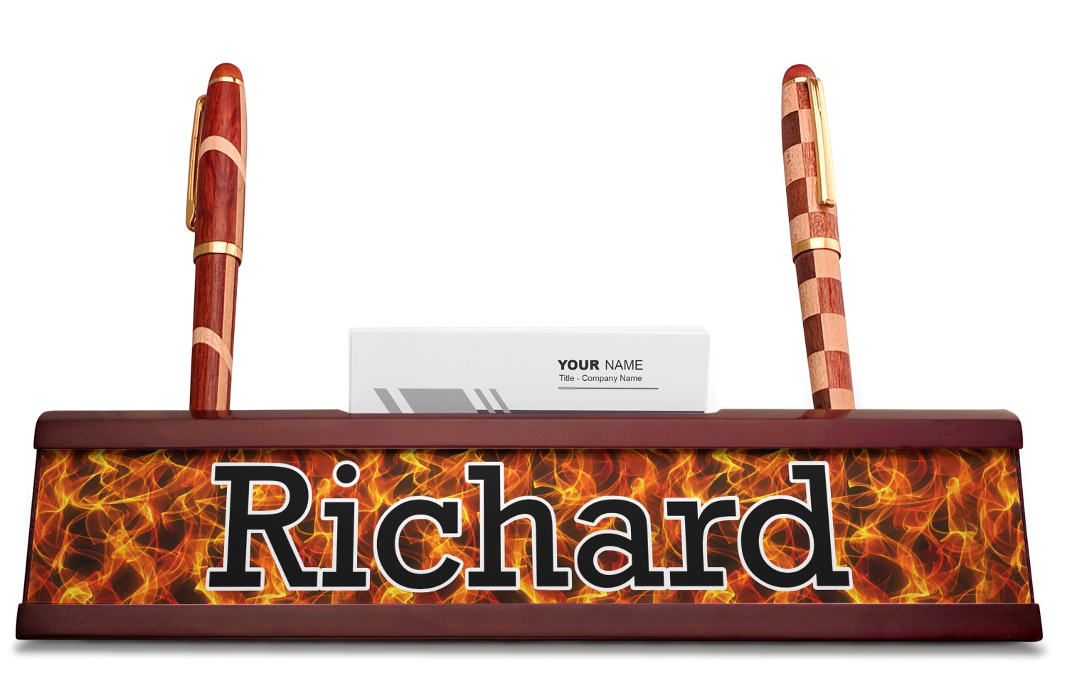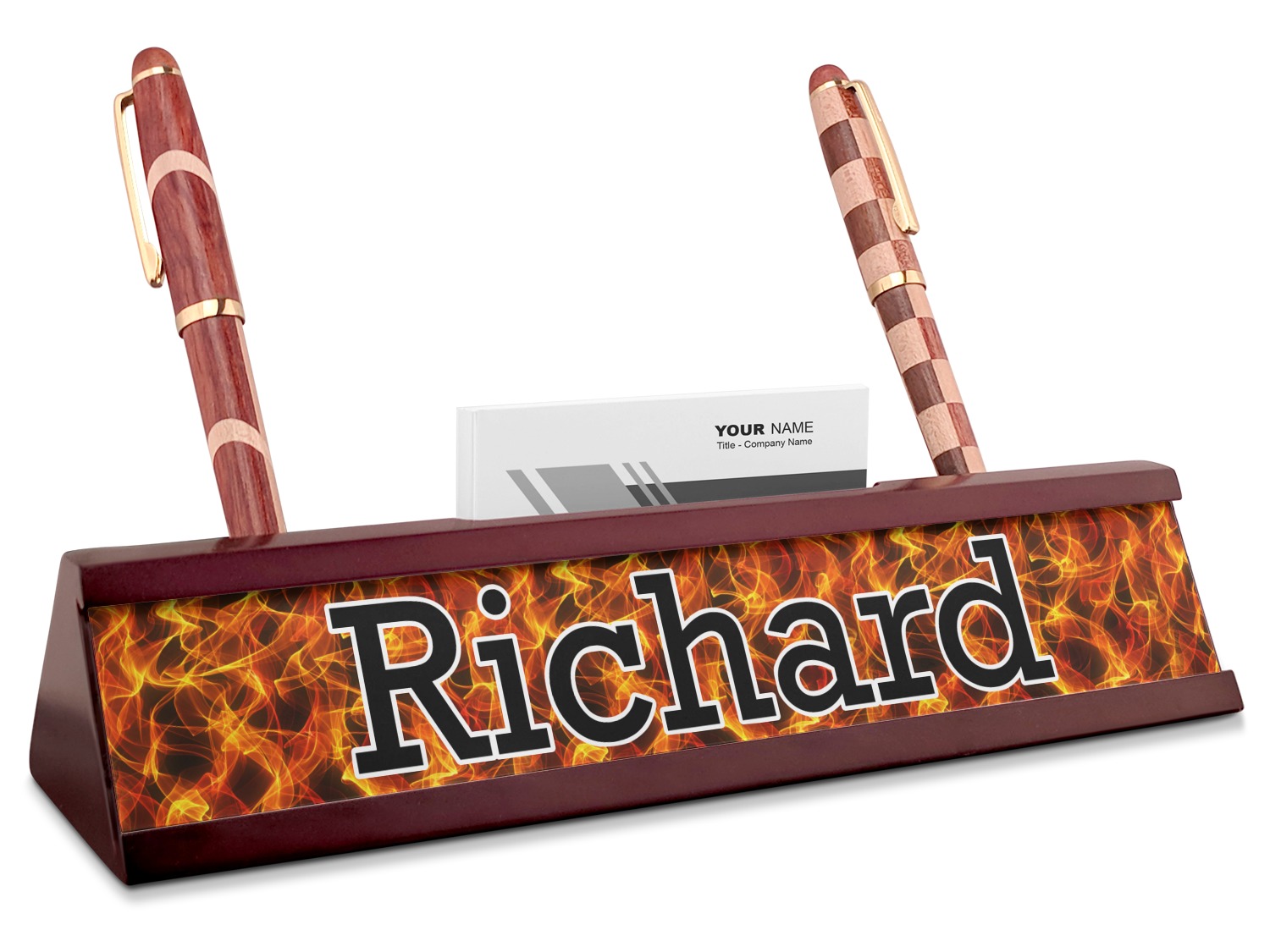 Your desk name plates are crafted from a high-quality, dark-cherry mahogany. At approximately 9.5 by 1.875 by 2.5 inches, this name plaque will fit perfectly, front and center, on your desk. Your customization spans across the entire face of the nameplate. Behind the nameplate lies a skinny slot that can fit approximately 15, traditionally-sized, business cards. You can also store your writing utensils on either side of this custom desk name plate.