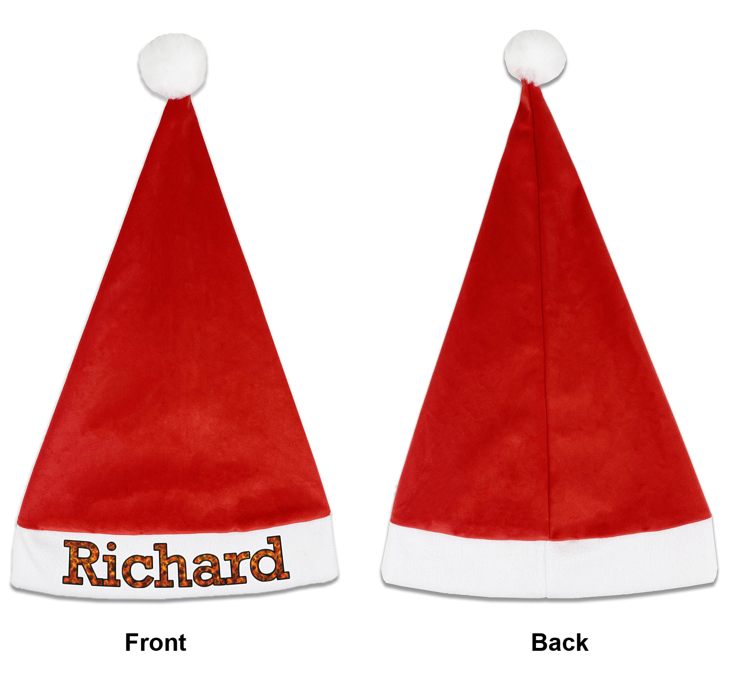 Our Santa hats are a soft, velvety polyester material. These customizable Santa hats are a classic red with white brimming and pom pom ball hanging off the hat tail just like Santa Claus! Each personalized Santa hat is approximately 17.5 L x 11.8 W. We offer two different styles to print your designs on the white brim - front or front & back.