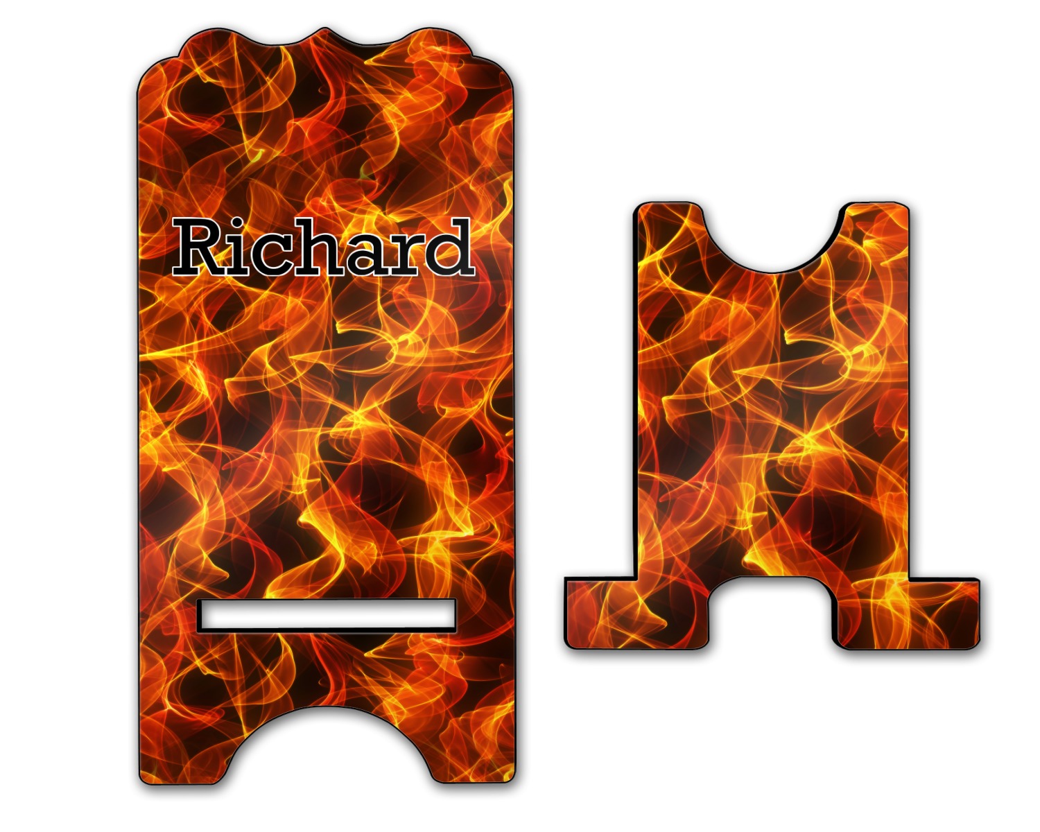 To meet your needs, we offer four variations of this IPhone stand. The backboard of the first version is shaped as a plain, yet sleek rectangle, and is available in two sizes. Our smaller size is approximately 4 by 3.25 by 7 inches, while the larger model is 4 by 3.77 by 8.5 inches. Alongside this model, we also provide you with a more decorative option. The upper part of our second version features a curved edge, for a classy, suave appearance. This phone holder is also sold in two sizes: a smaller version, which is 4 by 3.25 by 7 inches, and our larger model, which is 4 by 3.77 by 8.5 inches. Both models will support large phones, but the larger model is better if you wish to proudly display your personalized design.